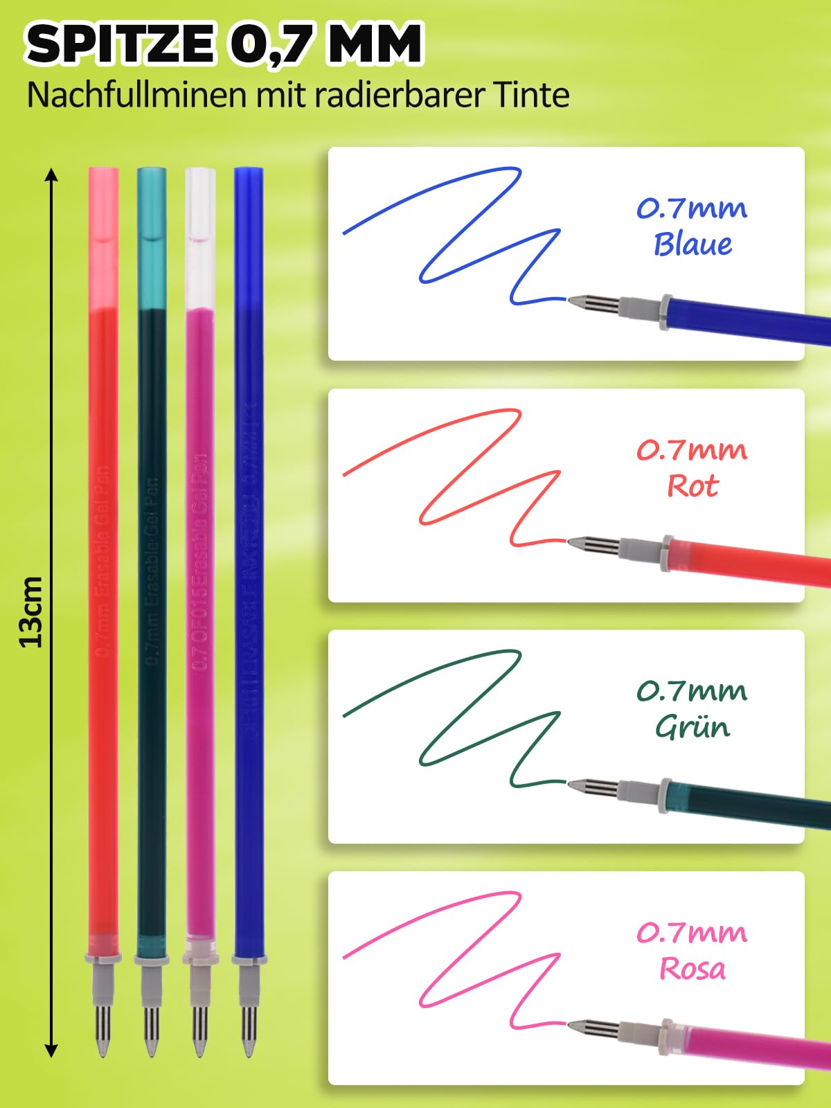 Nie wieder leere Stifte! Diese 12 Ersatzminen passen perfekt in deine Legami Stifte und sorgen für langanhaltenden Schreibspaß. Mit 0,7mm feiner Spitze und thermosensitiver Tinte, die sich rückstandslos ausradieren lässt. In 6 knalligen Farben: Blau, Rot, Grün, Lila, Pink und Orange - perfekt für kreative Projekte! Jede Mine schreibt über 200 Meter - das hält ewig! Super für Schule, Büro oder zum Zeichnen. Einfach einsetzen und loslegen - kompatibel mit Legami Patronen und Refill-Systemen. Die elastische Tinte schreibt butterweich und hinterlässt keine Spuren. Ideal für Notizen, Skizzen oder bunte Listen. Aber Achtung: Nicht für offizielle Dokumente geeignet! So machst du deine Lieblingsstifte wieder fit!