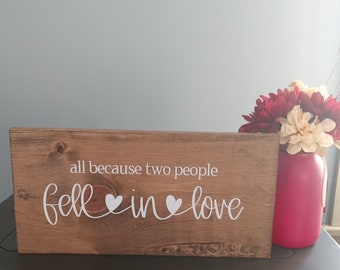 Rührende Wanddekoration mit dem Spruch 'All Because Two People Fell In Love' - perfekt für verliebte Paare und Familien! Dieses rustikale Holzschild wird in den USA hergestellt und überzeugt durch hochwertige Qualität. Der UV-Druck ist permanent und verblasst nicht, die Holzmaserung schimmert natürlich durch. Im Lieferumfang ist bereits ein Aufhänge-Seil enthalten - einfach aufhängen und fertig! Passt super in Wohnzimmer, Schlafzimmer, Flur oder als besondere Dekoration im Kinderzimmer. Ein wunderbares Geschenk zur Hochzeit, zum Jubiläum oder einfach als Liebesbeweis. Auf Wunsch kann das Schild sogar personalisiert werden - frag einfach nach! Bringt Gemütlichkeit und Liebe in deine vier Wände.