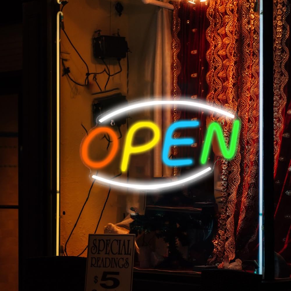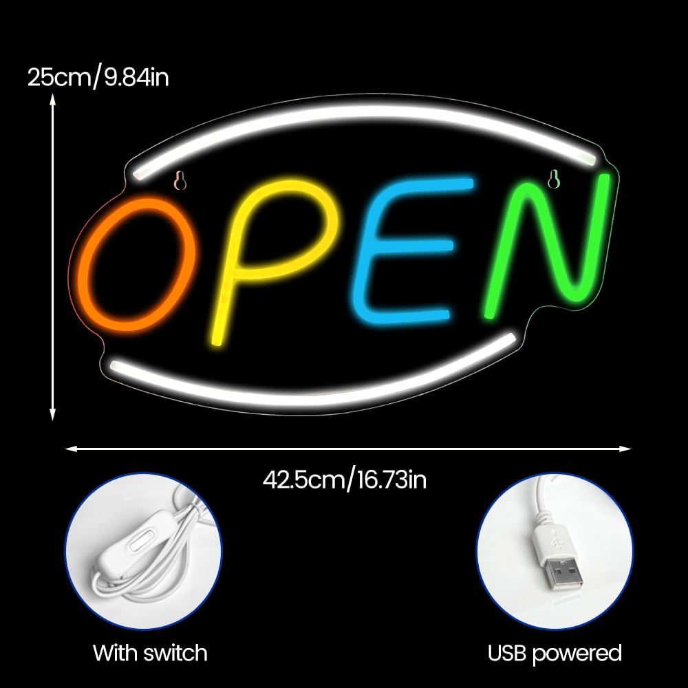 Mach dein Geschäft noch einladender mit diesem coolen Neon-Schild! Das 'Wir haben geöffnet'-Schild in 38x20cm leuchtet in bunten Neonfarben und zieht garantiert Blicke auf sich. Per USB anschließen (150cm Kabel) - an Steckdose, Powerbank oder Computer. Mit Dimmer für die gewünschte Helligkeit. Einfache Montage: Entweder aufhängen mit den mitgelieferten Haken oder einfach hinstellen. Perfekt für Läden, Cafés, Restaurants oder auch für coole Party-Deko zu Hause! Sieht aus wie echtes Neon, ist aber sicherer und energiesparender. Ein echter Hingucker, der Stimmung macht!