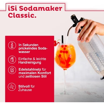 Mach deine eigenen sprudelnden Getränke - ganz ohne Flaschen schleppen! Der iSi Twist'n Sparkle Virtuoso verwandelt Wasser, Säfte, Wein und Cocktails in prickelnden Genuss. Hergestellt in Österreich mit rutschfester Silikon-Hülle. Einfach iSi Sodakapsel einlegen, Stab drehen - und schon hast du perfektes Sprudelwasser. Nur 0,95 Liter Fassungsvermögen, platzsparend für jede Küche. Ohne Pfand, ohne Aufwand, dafür mit jeder Menge Spaß! In verschiedenen frischen Farben erhältlich. Für alle, die gerne kreative Drinks mixen oder einfach nur erfrischendes Sodawasser genießen wollen. Qualität, die man schmeckt!