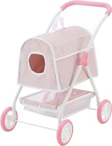 Was für ein niedlicher Puppenwagen! In rosa-grau gepunktetem Design mit praktischem Klappverdeck gegen Sonne und Regen. Super viel Stauraum unten im Korb und einer extra Windeltasche für all das Puppenzubehör. Der cremefarbene Eisenrahmen ist mega stabil und der Sitz waschbar. Einfach zusammenzuklappen und zu verstauen. Für Kinder ab 3 Jahren und absolut sicherheitsgeprüft. Deine Kleine wird ihn lieben - genau wie die Großen!