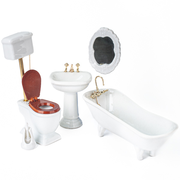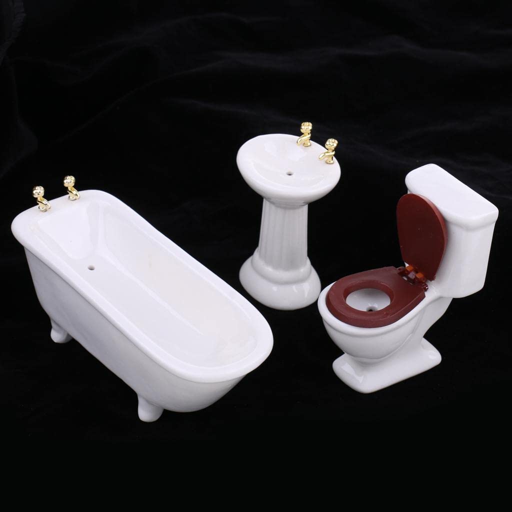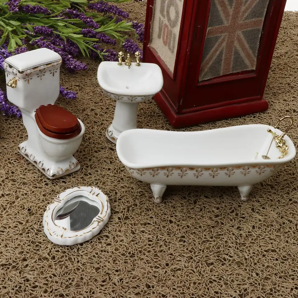 So niedlich! Dieses 3-teilige Miniatur-Badezimmerset im Maßstab 1:24 bringt Realismus in dein Puppenhaus. Enthalten sind eine Badewanne (ca. 6cm), Toilette (ca. 3,3cm) und Waschbecken (ca. 4,5cm) aus Keramik mit Metall- und Holzelementen. Die weiße Farbe und das exklusive Design sehen täuschend echt aus. Perfekt für erwachsene Bastler und Sammler - allerdings nicht als Kinderspielzeug geeignet. Mit feiner Handwerkskunst und charmanten Details wird dieses Set zum Highlight in deiner Miniatur-Welt. Ein wunderbares Geschenk für alle, die kleine Dinge lieben!