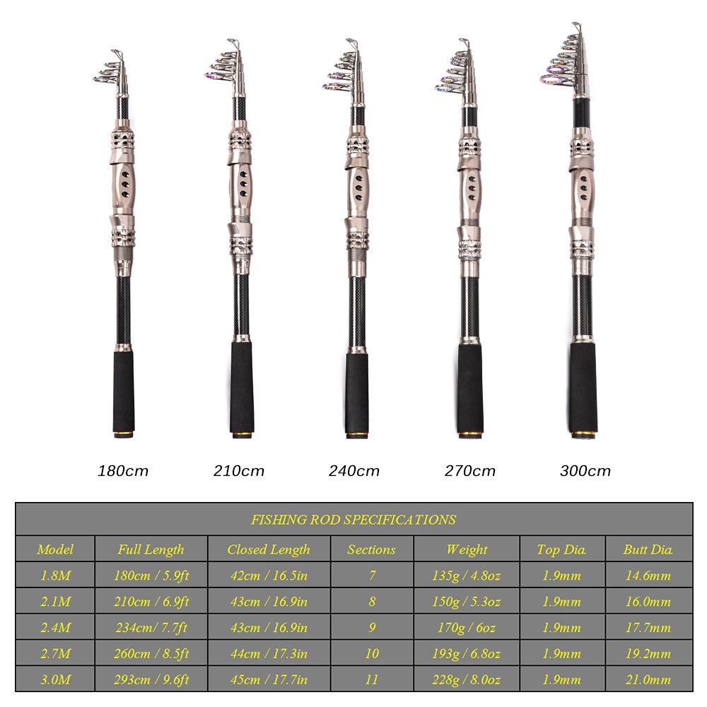 Hey Angler! 🎣 Suchst du ne praktische Angelrute, die nicht so viel Platz wegnimmt? Diese Teleskop-Rute aus Carbon Fiber ist genau das Richtige! Die gibt's in verschiedenen Längen von 1,8m bis 3,6m - such dir einfach deine Lieblingslänge aus.\n\nCarbon Fiber heißt: Super leicht, aber trotzdem mega stabil! Die wiegt nur zwischen 105g und 205g - kaum zu spüren in der Hand. Perfekt also für lange Angeltouren, wo jedes Gramm zählt.\n\nDie Führungen sind aus Edelstahl - rostfrei und langlebig. Und der Rollensitz ist auch dabei. Einfach deine Angelrolle reinschrauben, und schon kann's losgehen!\n\nDas coole an Teleskop-Ruten: Wenn du sie nicht brauchst, klappst du sie einfach zusammen. Passt in jeden Rucksack oder sogar ins Handschuhfach. Super praktisch für spontane Angel-Trips!\n\nEgal ob du ans Meer fährst, an den Fluss oder an den See - mit dieser Rute bist du für alles gerüstet. Und als Geschenk für Angel-Fans ist sie auch der absolute Hit! Einfach auspacken, auseinanderziehen - und schon kann der Angelspaß beginnen.