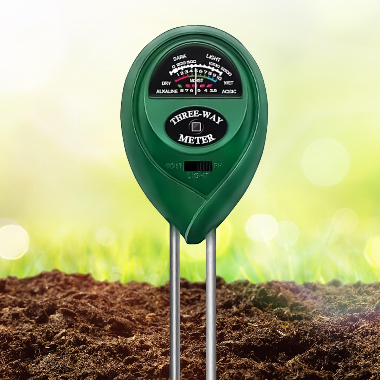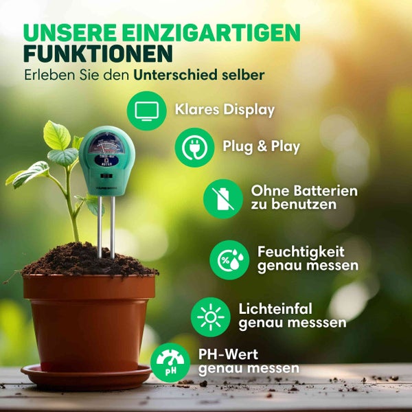 Endlich weißt du genau, was deine Pflanzen brauchen! Dieser 3-in-1 Bodentester misst Feuchtigkeit, pH-Wert und Lichtintensität - alles in einem Gerät. Einfach die Sonde etwa 2/3 tief in die Erde stecken, den Knopf drehen und sofort siehst du den Wert auf der großen, gut ablesbaren Anzeige. Das Beste: Es braucht keine Batterien! Die empfindliche Doppelnadel-Sonde liefert schnelle und genaue Ergebnisse. Super für Zimmerpflanzen, den Garten, Rasen oder die Landwirtschaft. So kannst du deine Pflanzen optimal pflegen - nicht zu viel und nicht zu wenig gießen, den richtigen pH-Wert kontrollieren und den perfekten Standort finden. Einfach unverzichtbar für jeden Pflanzenliebhaber!