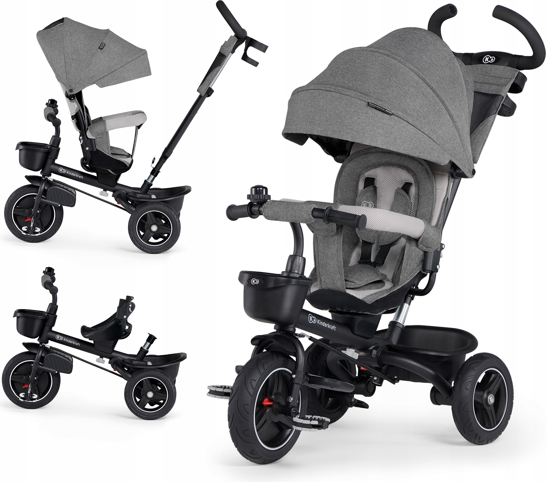 Das Dreirad das mitwächst! Dieses Kiddo 4-in-1 Modell ist perfekt für Kinder von 12 Monaten bis 5 Jahren. Mit Metallrahmen, Gummireifen und jeder Menge Features: drehbarer Sitz, verstellbarer Elternschiebegriff, Sonnendach, 3-Punkt-Sicherheitsgurt, und Rücktrittbremse. Der Clou: Du kannst die Vorderradpedale ein- und ausschalten - je nachdem ob dein Kind schon selber treten kann oder nicht. Maße: 98x51x110 cm, also schön stabil aber nicht zu klobig. EN-71 zertifiziert - sicherheitstechnisch also top. Mit Klingel, Staufach und rutschfesten Pedalen. Ob als erstes Fahrzeug für die Kleinen oder als robustes Dreirad für die Größeren - dieses Teil macht einfach alles mit. Und sieht dabei auch noch gut aus in Grau!