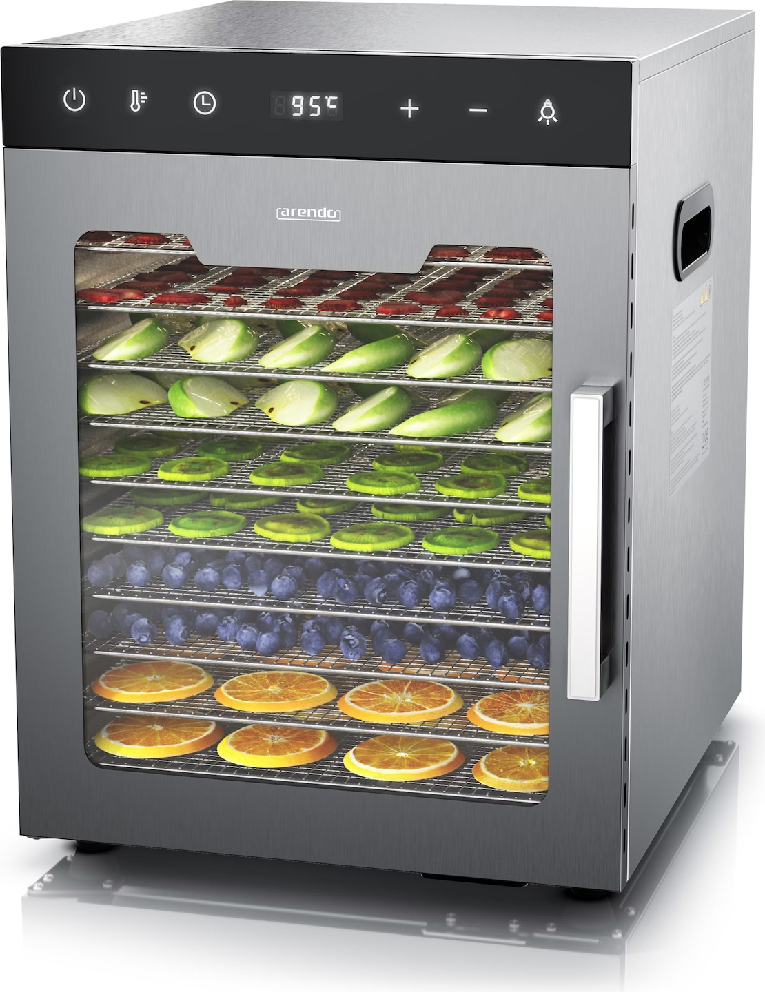 Krass, was du mit diesem Dörrautomaten alles machen kannst! 10 Edelstahl-Einschübe - jeder 30x28cm groß - bieten riesig Platz. Mit 800W Leistung und Temperatur von 30-90°C genau einstellbar. Trockne Obst, Gemüse, Fleisch, Kräuter oder sogar Blumen! Die Glasfront mit LED-Beleuchtung lässt dich den Prozess beobachten. Aus lebensmittelechtem 304 Edelstahl - absolut BPA-frei und hygienisch. Automatische Abschaltung und Überhitzungsschutz für totale Sicherheit. So machst du dir gesunde Snacks ohne Zusatzstoffe. Einfach Zeit und Temperatur einstellen und los geht's! Perfekt für Vorräte oder gesunde Knabbereien.