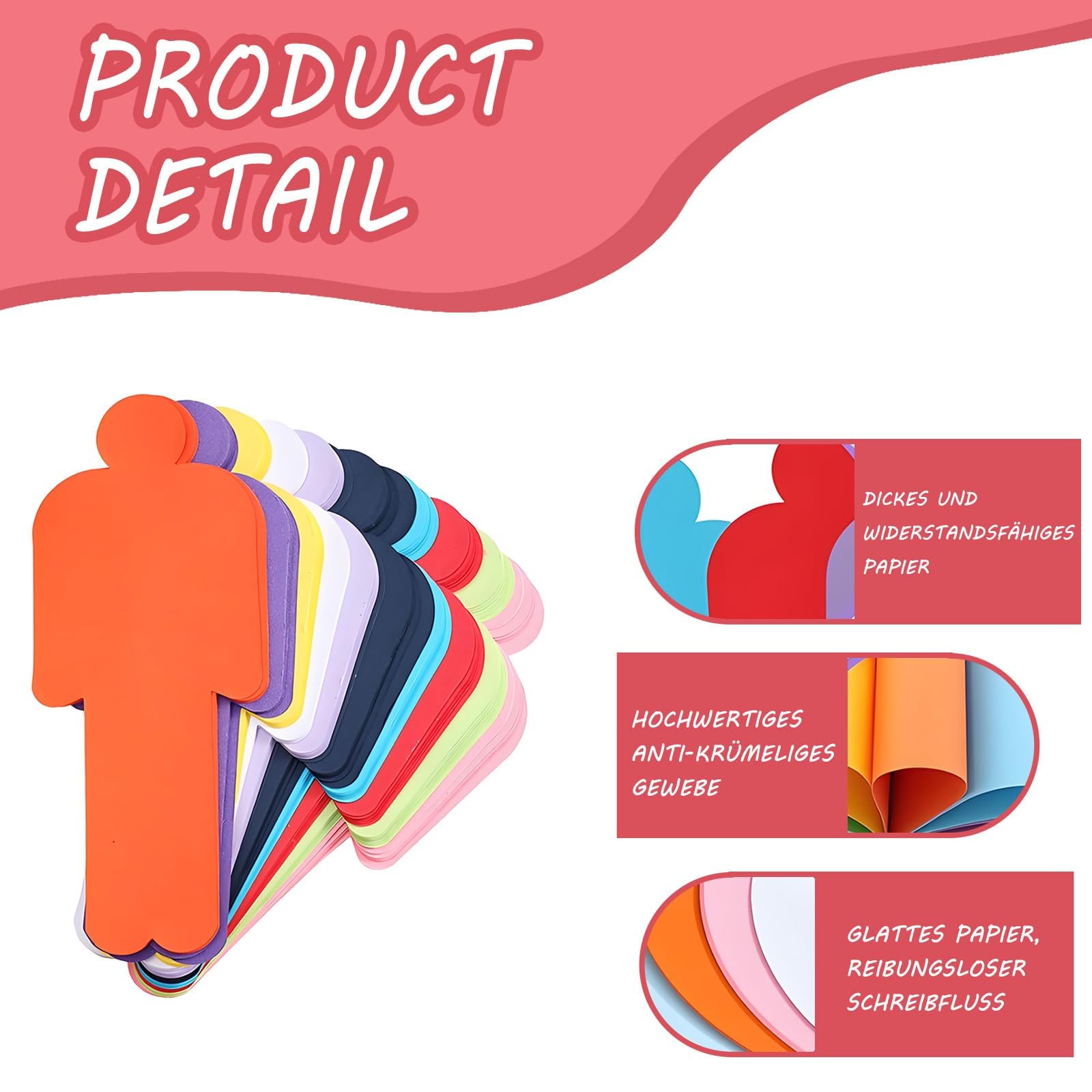 Wow, mit diesen bunten Karten wird jede Präsentation zum Hit! Das Set hat 200 Karten in 10 knalligen Farben - da findet jeder seine Lieblingsfarbe. Die menschliche Form ist nicht nur witzig, sondern macht die Karten auch super wiedererkennbar. Perfekt für Brainstorming, Workshops oder den Unterricht. Das Papier ist extra dick (240g Gesamtgewicht) und nimmt Tinte nicht durch - kannst also mit Filzstift, Kugelschreiber oder sogar Füller draufschreiben. Beidseitig beschreibbar, keine Flecken oder Verschmieren! Maße 20x8cm passen ideal in die Hand. Ob für's Büro, die Schule oder Uni - hier kannst du deine Gedanken ordnen und kreativ werden. Die sauber geschnittenen Kanten splittern nicht aus. Einfach auspacken und loslegen - deine Ideen werden dich begeistern!