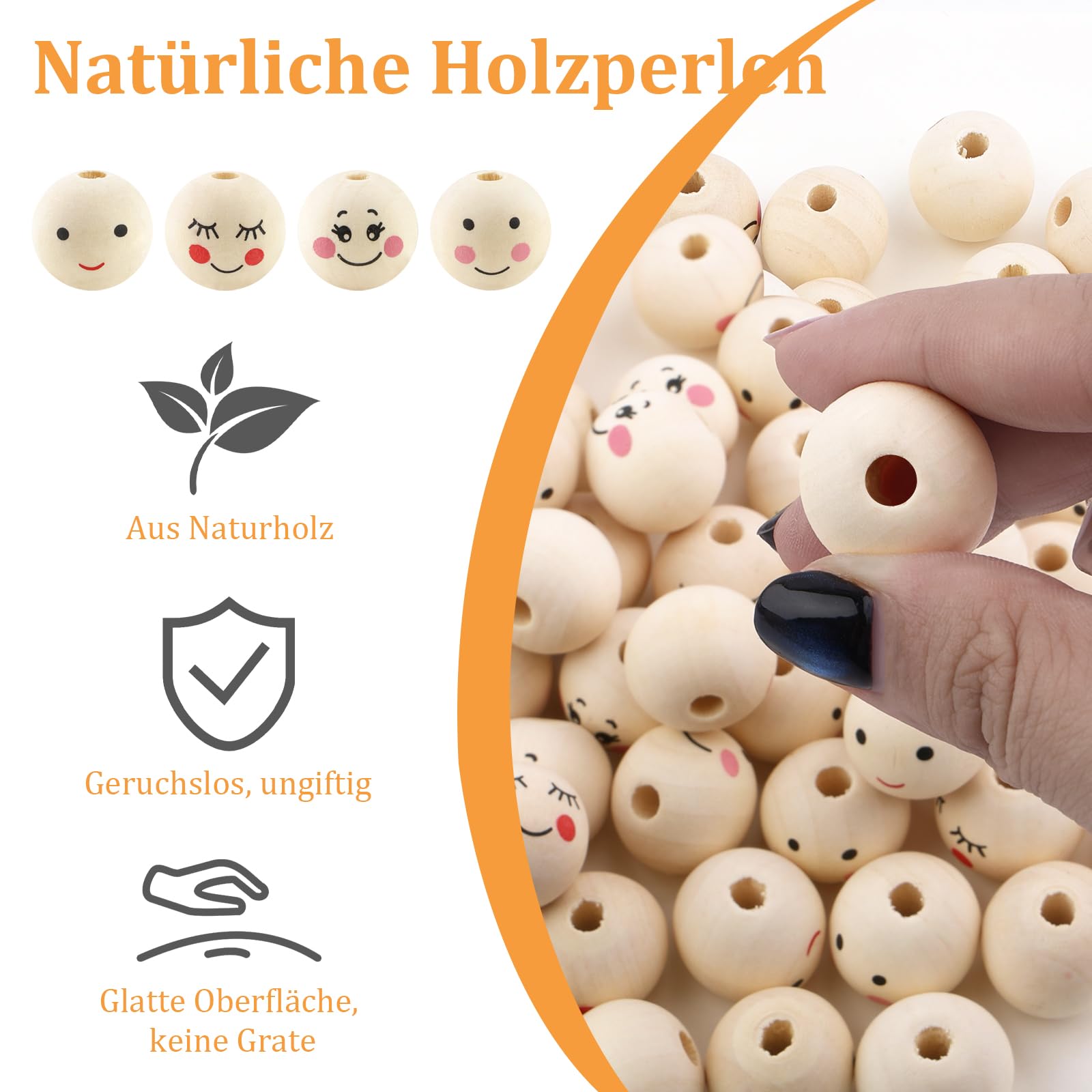 Kreativ-Spaß für Groß und Klein! Dieses umfangreiche Set enthält 100 Holzperlen mit süßen Gesichtern in 4 verschiedenen Designs. Jede Perle hat 20mm Durchmesser und ein 4,5mm Loch - perfekt zum Auffädeln. Inklusive 10m Fädelschnur und einer Perlennadel, sodass du sofort loslegen kannst. Die Perlen sind aus natürlichem Holz, fein geschliffen und ohne scharfe Kanten. Die Vorderseite hat ein lächelndes Gesicht, die Rückseite kannst du selbst bemalen! Ideal für Sorgenpüppchen, Armbänder, Halsketten oder Schlüsselanhänger. Fördert die Feinmotorik und Kreativität - perfekt für Bastelkurse, Kindergarten oder Familien-Nachmittage. Mach deine eigenen einzigartigen Kreationen!