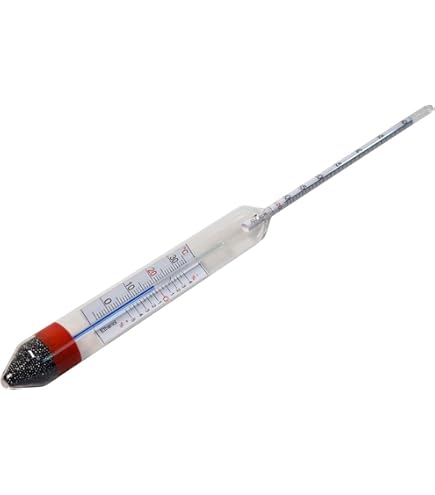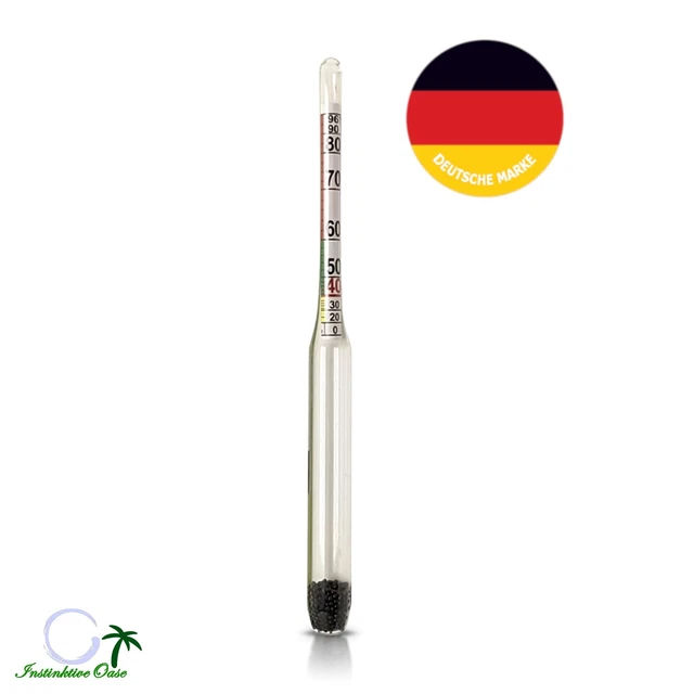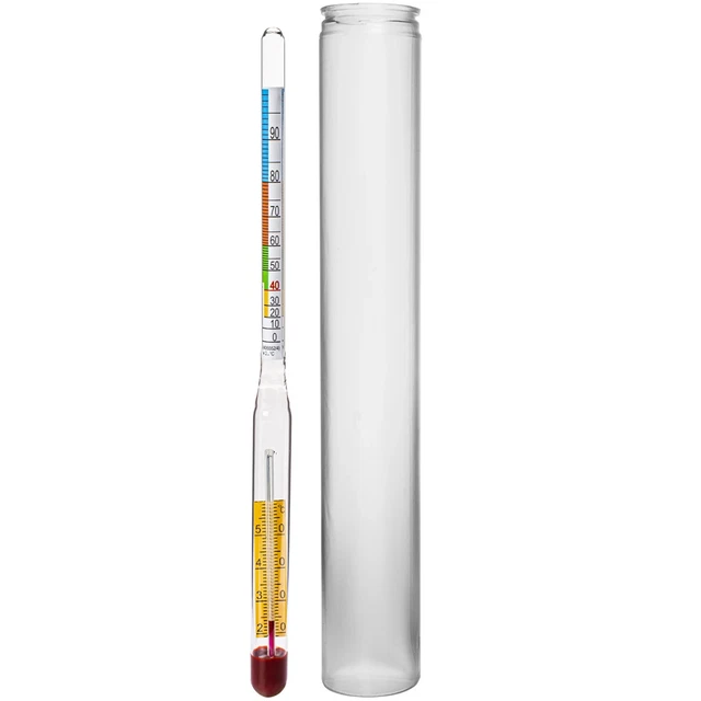 Für perfekte Spirituosen und Liköre! Dieses professionelle Alkoholmeter mit integriertem Thermometer misst präzise den Alkoholgehalt von 0-100 Vol%. Mit Temperaturausgleichsskala für genaue Ergebnisse. Das Glas-Aräometer ist 29cm lang und wird in einer praktischen Schutzhülle geliefert, die auch als Eintauchzylinder dient. Einfach in die Flüssigkeit tauchen und an der Skala ablesen - bis 40% in 2er-Schritten, darüber in 1er-Schritten. Wichtig: Nur für reine Alkohol-Wassergemische geeignet, nicht für Bier, Wein oder gezuckerte Liköre. Für Hobby-Brenner und Spirituosen-Hersteller das perfekte Werkzeug zur Qualitätskontrolle.