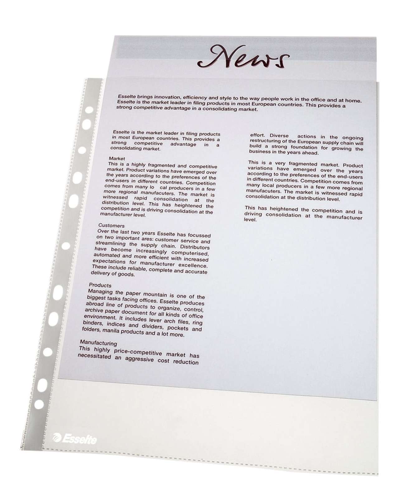 Ordnung muss sein! Mit diesen Esselte Klarsichthüllen behältst du alle deine Dokumente im Blick und geschützt. In der Packung sind 100 transparente Hüllen im Format A4 - das hält ewig! Die Hüllen sind dokumentenecht, das heißt sie verfälschen keine Kopien und schützen vor Fett und Wasser. Praktisches Daumenloch für einfaches Herausnehmen der Blätter. Jede Hülle fasst bis zu 40 Blätter und hat hitzeversiegelte Kanten, damit nichts reißt. Öffnung oben und rechts macht das Einlegen zum Kinderspiel. Perfekt für Büro, Schule oder zu Hause - ob für Bewerbungsunterlagen, Präsentationen oder wichtige Dokumente. Mit 75 Mikron Stärke sind sie robust und langlebig. Einfach ein Klassiker, der nie aus der Mode kommt!