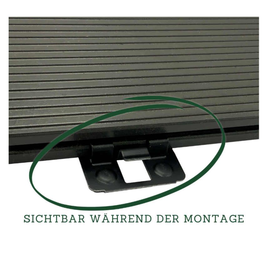Perfekt für deine Terrassen-Projekte! Diese 100 WPC-Clips aus Edelstahl machen deine Terrasse nicht nur schöner, sondern auch stabiler. Mit 36x40mm Größe für professionelle Ergebnisse.\\n\\nDie unsichtbare Befestigung sorgt für ein cleanes Gesamtbild - keine störenden Schraubenköpfe mehr auf deiner Terrasse! Die Clips verschwinden komplett zwischen den Dielen.\\n\\nErhältlich in Schwarz oder Silber, mit verschiedenen Spaltbreiten (3mm oder 5mm) und Nuthöhen (7mm, 8mm, 9mm). Vor dem Kauf unbedingt deine Dielenmaße checken!\\n\\nAus rostfreiem Edelstahl gefertigt, halten diese Clips auch bei Regen, Schnee und Sonne problemlos stand. Kein Rost, keine Korrosion - einfach jahrelang Freude an deiner Terrasse.\\n\\nEgal ob WPC, Kunststoff, Bambus oder Eco-Holz - diese Clips passen für fast alle Terrassendielen. Einfach montieren, die gleichmäßige Fuge genießen und sich über die stabile Verlegung freuen. Profi-Ergebnis für Heimwerker!