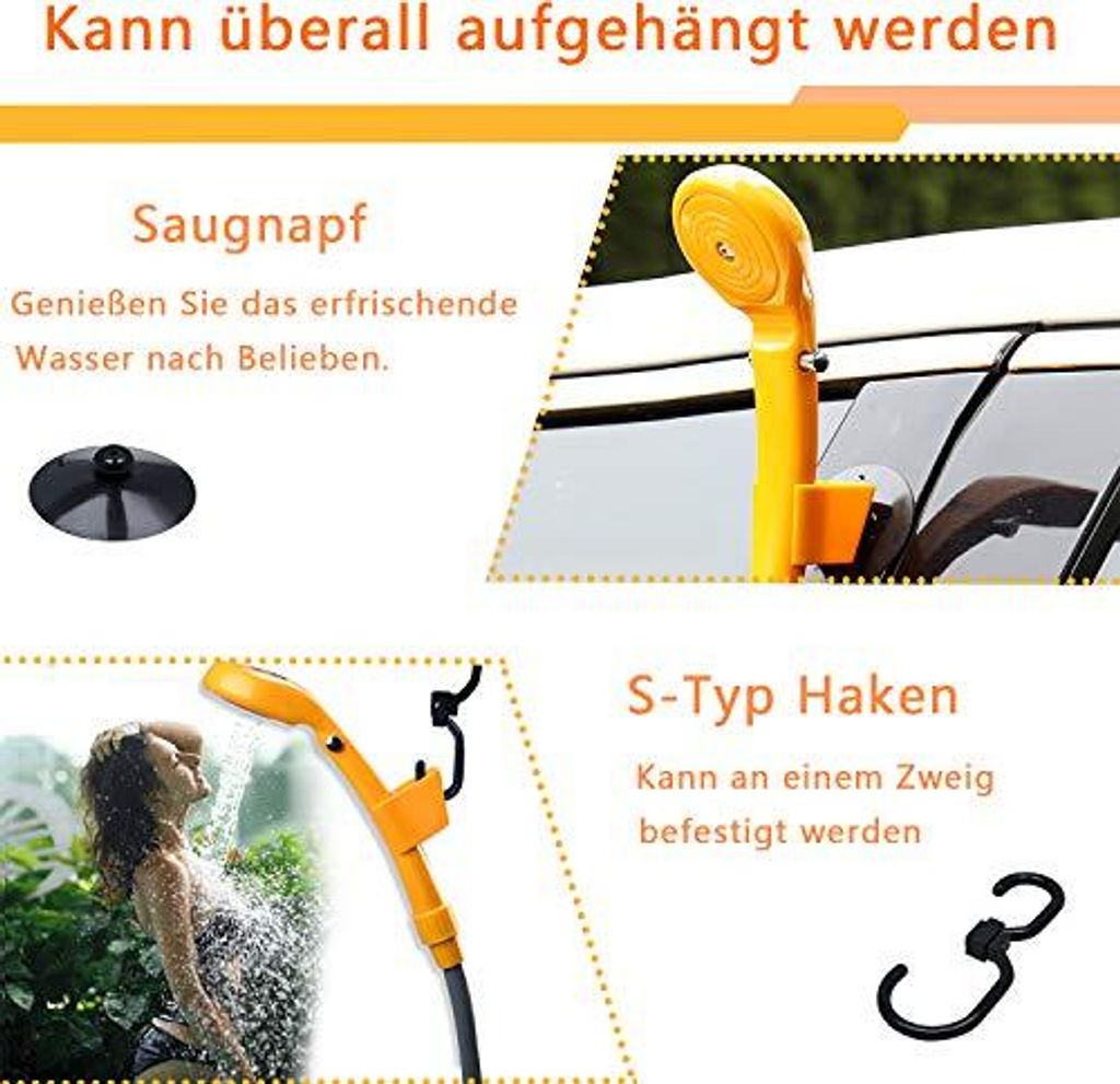 Endlich überall duschen können! Diese praktische 12V Dusche mit Tauchpumpe macht's möglich. Perfekt für Camping-Ausflüge, Wohnmobil-Reisen oder die Gartenarbeit. Das 10 Meter lange Kabel gibt dir viel Bewegungsfreiheit und die Pumpe sorgt für einen kräftigen Wasserstrahl. Einfach in einen Eimer oder Behälter mit Wasser stellen und an die 12V Steckdose deines Autos oder Wohnmobils anschließen. Super praktisch auch nach dem Schwimmen im See oder Meer, um Salz und Sand abzuspülen. Die kompakte Größe macht die Dusche zum perfekten Reisebegleiter. Nie wieder auf Komfort verzichten - mit dieser Dusche genießt du frische Hygiene wherever you go!