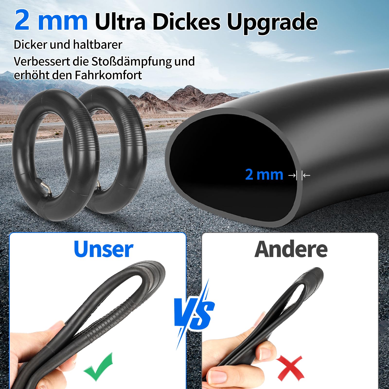 Platten adé! Dieses praktische 2er-Set mit Kinderwagen-Schläuchen ist die perfekte Lösung für kaputte Reifen. Speziell für Kinderwagen mit der Reifengröße 10x2.0, 10x2.125 und 10x2.0 (54-152). Aus hochwertigem 1,2mm Butylkautschuk gefertigt, der Stöße auf unebenen Wegen perfekt dämpft. Das 45° Winkelventil macht das Aufpumpen super einfach. Im Lieferumfang sind 2 praktische Montagehebel enthalten - damit bekommst du auch den widerstandsfähigsten Reifen problemlos von der Felge. Die spezielle Oberflächenstruktur der Schläuche erleichtert die Montage erheblich. Bleifrei und absolut sicher für dein Kind - kann auch in der Nähe von Lebensmitteln gelagert werden. Ganzjahrestauglich und extrem verschleißfest. Einfache Montage: Schlauch in den Reifen legen, gleichmäßig verteilen, Ventil verschrauben und auf 1,2-1,5 Bar aufpumpen. Mit 30-Tage-Rückgaberecht!