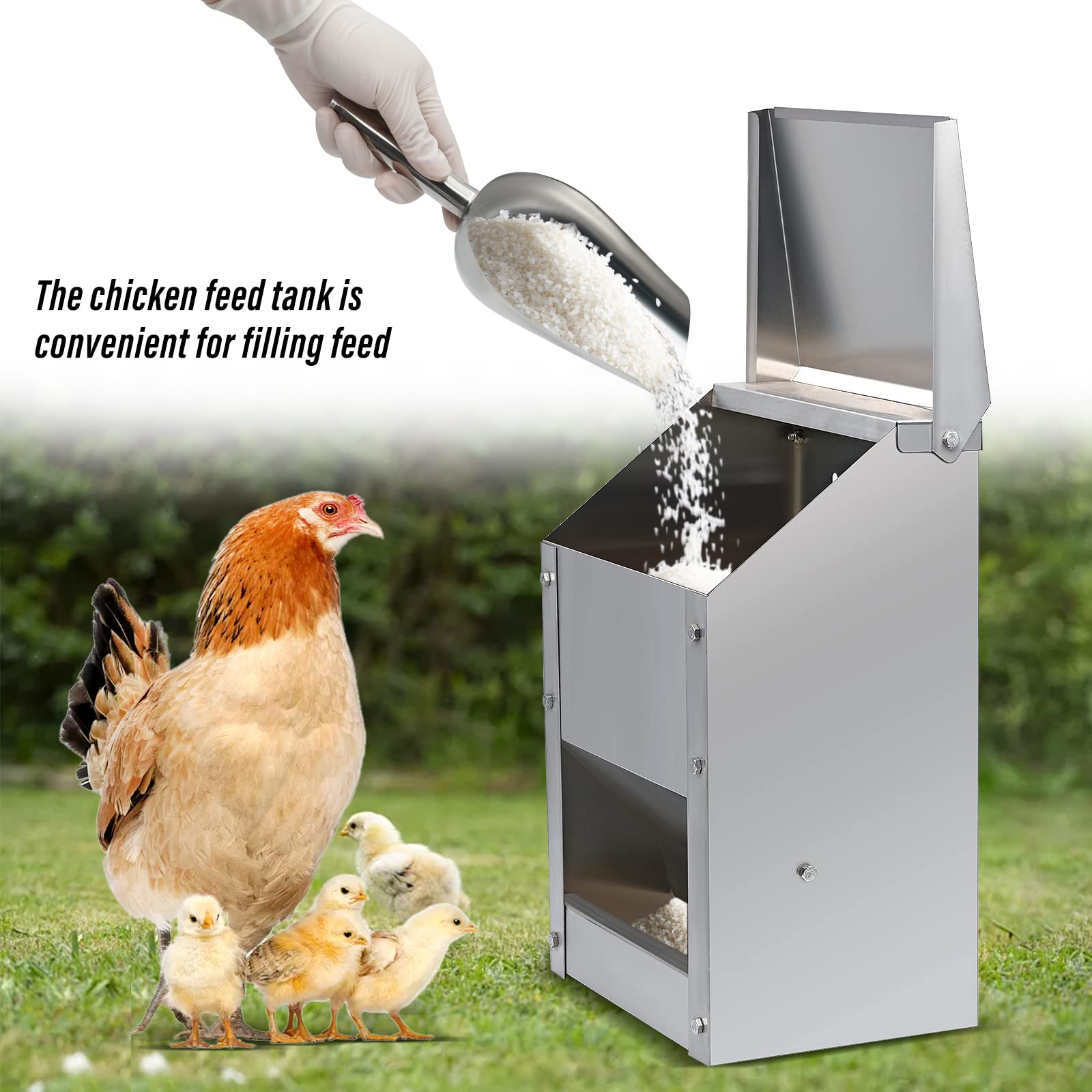 Der perfekte Futterautomat für deine Hühner und Enten! Mit 11,5KG Fassungsvermögen ideal für größere Geflügelherden. Aus wetterfestem, rostfreiem verzinktem Stahl gefertigt, hält dieser Futterspender jahrelang. Das Futter bleibt trocken und sauber, dank des praktischen Klappdeckels. Flexibel einsetzbar - sowohl zum Aufstellen als auch für die Wandmontage geeignet. Die zwei Befestigungsöffnungen auf der Rückseite ermöglichen vielseitige Aufstellmöglichkeiten. Im Lieferumfang enthalten: Futterschaufel, Handschuhe und 1m Schutzstreifen. Einfache Reinigung und Befüllung - der Deckel lässt sich leicht öffnen. Reduziert Futterverluste und hält Ungeziefer fern. Perfekt für den Einsatz im Hühnerstall oder im Freien. Mach die Fütterung deiner Tiere einfacher und hygienischer mit diesem robusten Futterspender. Dein Geflügel wird es dir danken!