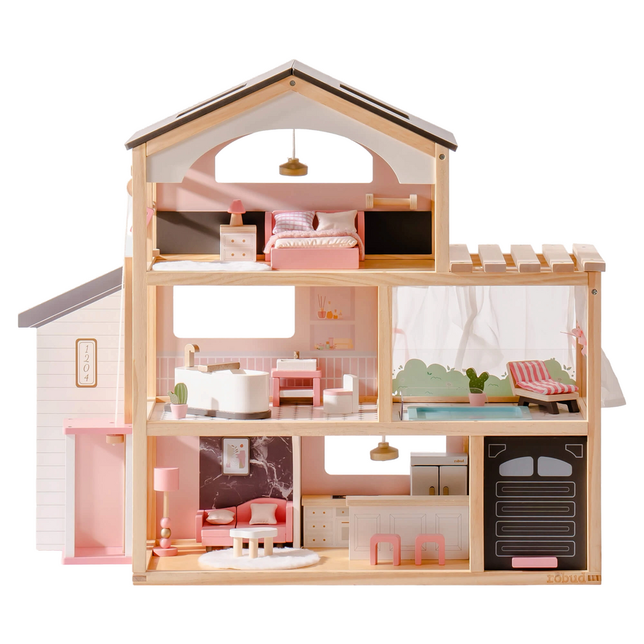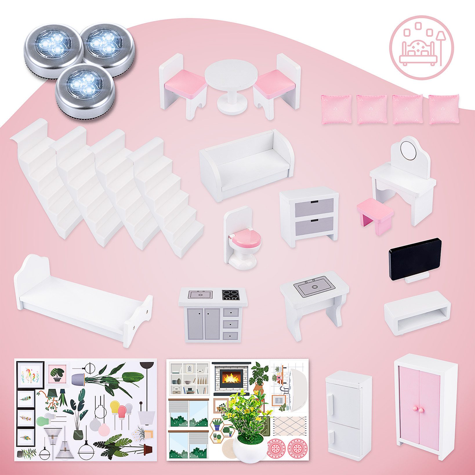 Wow, dieses Barbie Puppenhaus ist der absolute Traum für jedes Kind! Ganze 118cm hoch und mit 3 Stockwerken, 7 Räumen plus Dachboden und Terrasse - da ist richtig viel Platz für Spielspaß! Komplett aus Holz und MDF, super stabil und mit abgerundeten Kanten für sicheres Spielen. Im Lieferumfang: Vollständige Möblierung mit Bett, Schrank, Sofa, Küche, Tischen, Stühlen und sogar einer Toilette! Das besondere Highlight: Eingebaute LED-Beleuchtung, die die Räume gemütlich erstrahlen lässt. Mit coolen Aufklebern kann das Haus individuell gestaltet werden. Perfekt für Barbie-Puppen bis 30cm Größe. Ab 3 Jahren geeignet - das ideale Geschenk für Geburtstage, Weihnachten oder einfach so! Fördert Kreativität und Rollenspiele - stundenlangen Spielspaß garantiert!