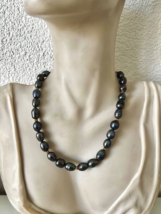 Diese atemberaubende Halskette mit echten Tahiti-Perlen ist ein absoluter Klassiker! Die natürlichen Perlen in schwarz-blau schimmern je nach Lichteinfall in den schönsten Farbtönen. Mit einer Größe von 12-11mm sind sie der perfekte Blickfang. Die exzellente Verarbeitung und der zeitlose Stil machen diese Kette zu einem Must-Have für jede Schmucksammlung. Ob zum Business-Outfit, zum Abendkleid oder einfach zum Alltagslook - diese Perlenkette passt immer und verleiht jedem Outfit eine besondere Eleganz. Ein Schmuckstück, das man sofort haben möchte und das garantiert Komplimente erntet!