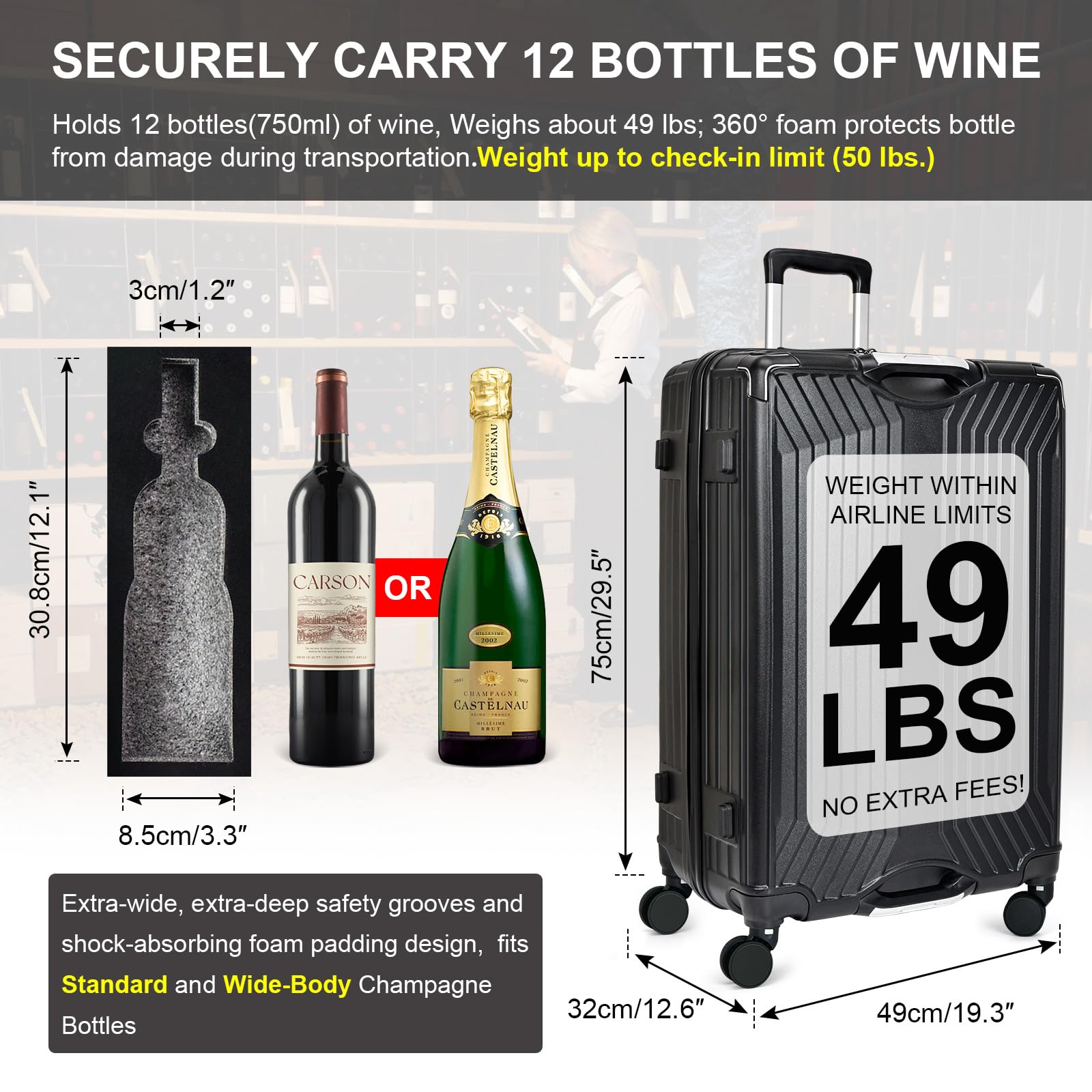 Weinliebhaber, dieser Koffer ist ein Traum für Reisen! Passt 12 Standard-Flaschen à 750ml - da könnt ihr eure Lieblinge mitnehmen! TSA-zugelassen - kein Problem am Flughafen! Die Flaschen liegen sicher in ihren Fächern - kein Klappern oder Brechen! 71cm groß - handlich aber geräumig! Perfekt für Weinproben, Urlaub oder als Geschenk! Macht das Reisen mit Wein so viel einfacher! Endlich müsst ihr nicht auf eure Lieblingsweine verzichten! Einfach einpacken und checken - euer Wein kommt sicher an! Das perfekte Geschenk für jeden Wein-Enthusiasten!