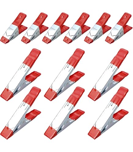 Diese 12 robusten Federklemmen sind die Alleskönner in deiner Werkstatt! Mit 100 mm Länge und 32 mm Backenöffnung passen sie für unzählige Projekte. Die gummierten Spitzen schützen deine Materialien vor Kratzern - ob Holz, Kunststoff oder Stoff. Aus Edelstahl und Aluminiumlegierung gefertigt, halten sie ewig und bieten trotzdem leichten Komfort. Perfekt für Holzarbeiten, um Hintergründe in der Fotografie zu befestigen oder für alle möglichen Bastelprojekte. Die rote und silberne Farbkombination sieht nicht nur gut aus, sondern hilft auch beim schnellen Finden in der Werkzeugkiste. Mit 12 Stück hast du immer genug Klemmen parat, auch für größere Projekte. Einfach aufdrücken und der sichere Halt ist garantiert - diese Federklemmen werden deine neuen Lieblingshelfer!