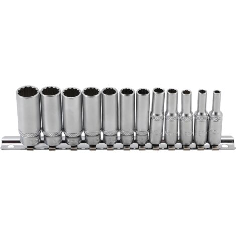 Das perfekte Set für jede Werkstatt! 12 Stecknüsse von 5/32\ bis 9/16\ mit praktischem 1/4 Zoll Antrieb. Aus robustem Chrom-Vanadium Stahl - hält auch bei täglichem Einsatz. Das 12-Kant Profil gibt dir 12 verschiedene Ansetzmöglichkeiten, super praktisch bei schwer erreichbaren Schrauben. Jede Nuss ist 5 cm lang für optimale Kraftübertragung. Mit Metall-Schiene und Schnellverschluss - alles ordentlich an seinem Platz. Perfekt für Auto, Motorrad, Fahrrad und Haushaltsgeräte. Kompatibel mit allen gängigen 1/4\ Ratschen und Verlängerungen. Das Set wiegt nur 450g und ist mit 19 cm Schienenlänge super kompakt. Ob Profi oder Hobby-Schrauber - mit diesem Set bist du für alle Zoll-Schrauben bestens ausgerüstet!