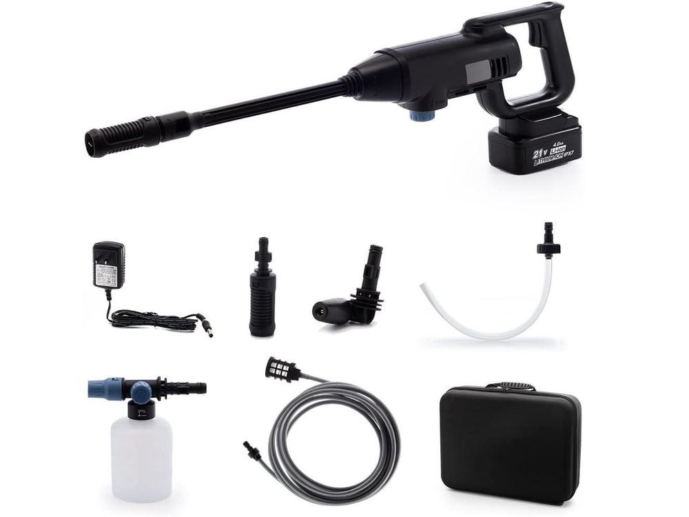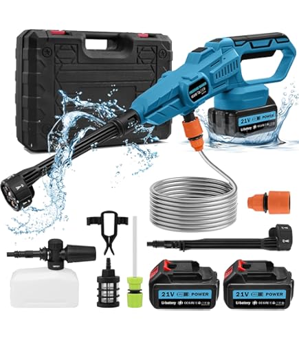 Ohne Kabel, ohne Strom - einfach reinigen! Dieser tragbare Hochdruckreiniger mit 1200 PSI Druck und 4,5 l/min Durchfluss macht Schluss mit lästigen Schläuchen. Mit 2x 4000mAh Akkus bis zu 40 Minuten Betrieb. Einfach an Wasserhahn anschließen oder aus Eimer/Teich Wasser entnehmen. 6-in-1 Düse für verschiedene Sprühmodi, inklusive Schaumpistole für Auto-Shampoo. 10 Meter Schlauch für große Reichweite. Perfekt für Auto, Terrasse, Zaun - überall wo Wasser hinkommt! Alles sicher verpackt im praktischen Werkzeugkoffer.