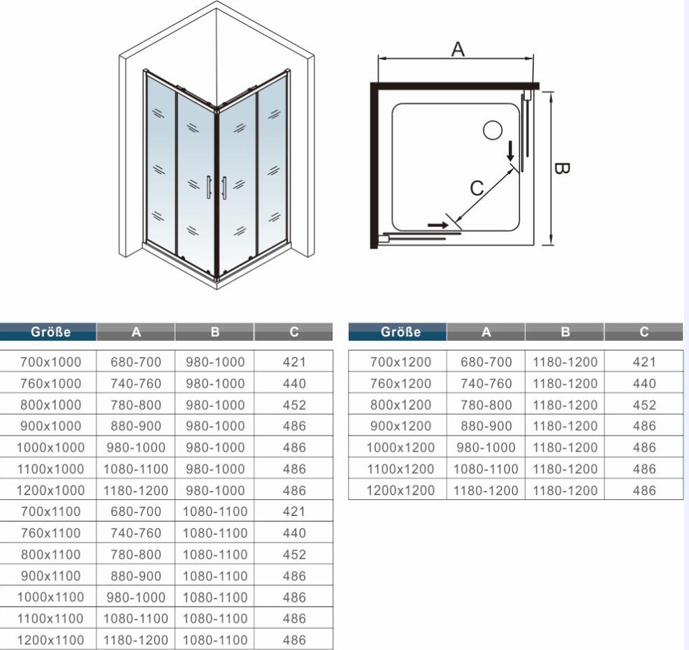 Willst du dein Bad aufwerten? Diese Duschkabine mit Eckeinstieg ist genau das Richtige! Mit 120x80cm Größe (einstellbar 1180-1200/780-800mm) und 185cm Höhe passt sie super in jede Ecke. Aus 5mm ESG Sicherheitsglas - richtig stabil und spritzwassergeschützt. Ohne Duschtasse - du kannst sie also sowohl auf ner vorhandenen Duschtasse als auch ebenerdig montieren. Das 8-Rollen-System macht das Öffnen und Schließen super leicht und leise. Und das beste: Die unteren Türrollen sind aushängbar - so kannst du die Tür ganz easy reinigen! Der Aluminiumrahmen ist hochwertig, glatt und kratzunempfindlich, der Türgriff aus robustem ABS-Kunststoff. Montagematerial ist schon im Lieferumfang dabei - also alles da, was du brauchst. Beidseitig montierbar, ob rechts oder links - total flexibel. Für alle, die sich ne moderne, praktische Dusche wünschen, die auch noch einfach zu reinigen ist. Mach dein Bad zum Wohlfühl-Ort! Einfach aufbauen und dich jeden Morgen über die praktische Dusche freuen.