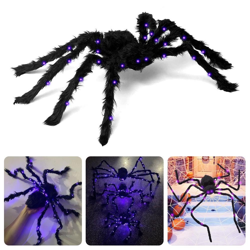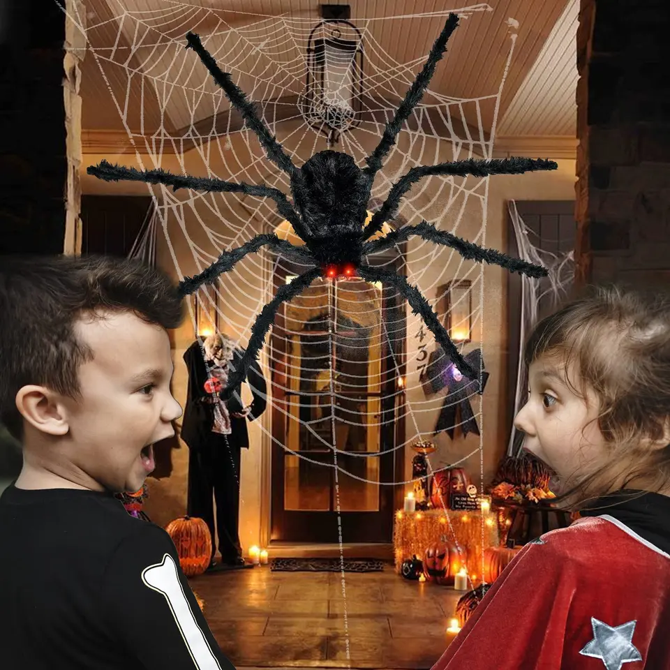 Boom! Diese Halloween-Deko jagt deinen Gästen richtig Angst ein! Das Set hat alles was du brauchst: eine riesige 125cm LED-Spinne mit leuchtend roten Augen, 20 kleine schwarze Spinnen und ein 60g Spinnennetz. Die Riesenspinne ist aus Kunststoff, Plüsch und Metall - sieht mega realistisch aus! Mit schwarzem Fell und diesen gruseligen roten Augen. Die langen Beine lassen sich biegen und in verschiedene Positionen bringen. Stell sie aufs Dach, ans Tor, an die Tür oder ins Spinnennetz - überall macht sie eine super Figur. Perfekt für die Halloween-Party im Garten oder drinnen. Die LED-Augen leuchten richtig unheimlich. Erschreck deine Gäste und sorg für die perfekte Grusel-Atmosphäre! Einfach aufbauen und sofort ist Halloween-Stimmung da. Das Must-have für jede Halloween-Party - da kriegst du richtig viele Komplimente!