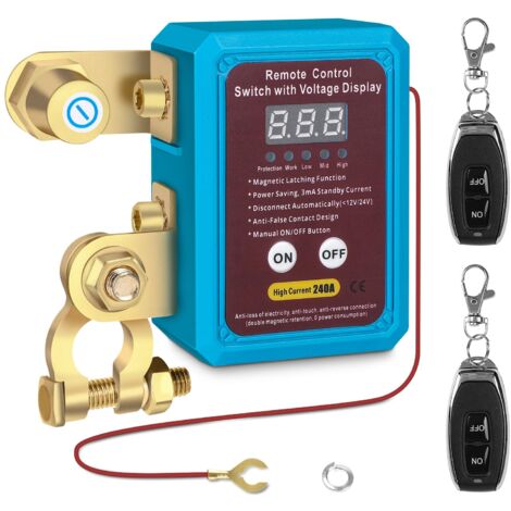 Schütze deine Autobatterie vor Diebstahl und Tiefentladung! Dieser ferngesteuerte Batterietrennschalter sorgt für Sicherheit und längere Batterielebensdauer.\n\nIntelligente Features:\n• Automatische Abschaltung bei 11,8V - verhindert Tiefentladung\n• Fernbedienung für bequeme Bedienung\n• Deaktivierung bei 13,5V - Sicherheit während der Fahrt\n• Manueller Notfallschalter\n• Standby-Stromverbrauch: nur 3 mA\n\nTechnische Daten:\n• Nennstrom: 240 A\n• Spannung: 12 V\n• Momentanstrom: 500 A\n• Abschaltschwelle: 11,8V ± 0,2V\n\nPerfekt für:\n• Auto, Wohnmobile und Boote\n• Langzeitparken\n• Diebstahlschutz\n• Oldtimer und Saisonfahrzeuge\n• ATVs und Quads\n\nEinfach in die Batterieleitung einbauen und die Fernbedienung mitnehmen. Wenn du das Auto verlässt, einfach per Fernbedienung abschalten - schon ist die Batterie vor unbefugtem Zugriff und Entladung geschützt. Die automatische Abschaltung verhindert, dass die Batterie durch vergessene Verbraucher leer wird.\n\nIdeal für alle, die ihr Fahrzeug sicher parken oder die Batterielebensdauer verlängern wollen!