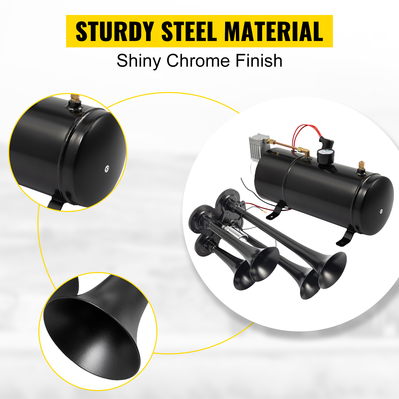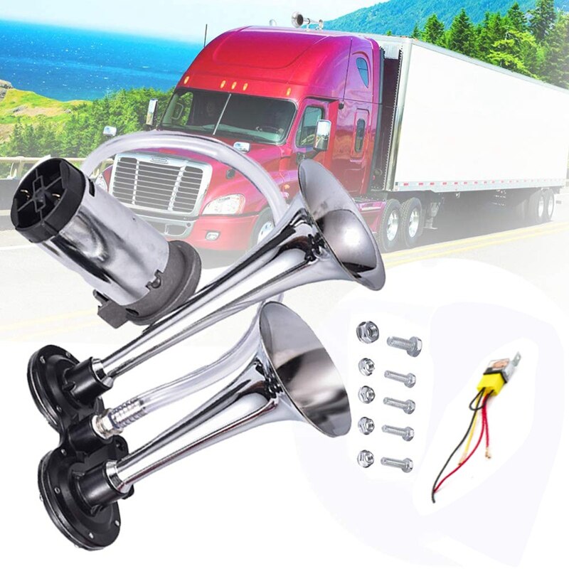 Achtung, jetzt wird's laut! Dieses 4-Trompeten Lufthorn von Yctze bringt satte 150DB auf die Straße - da hört dich wirklich jeder! Perfekt für alle, die sich Gehör verschaffen wollen.\n\nHergestellt aus robuster Zinklegierung, ist die Hupe absolut wetterfest und rostfrei. Egal ob Regen, Schnee oder Hitze - sie funktioniert immer zuverlässig.\n\nMit 12-24V Betriebsspannung passt sie zu den meisten Fahrzeugen: Autos, LKWs, Boote, sogar Züge - dieses Horn macht überall Eindruck!\n\nDie Installation ist super einfach - das Set enthält alle notwendigen Teile. Kein kompliziertes Bohren, kein Spezialwerkzeug nötig. Einfach anschließen und los geht's!\n\nMit 30W Leistung und 10A Stromstärke ist dieses Horn ein echter Power-Profi. Mach dein Fahrzeug unüberhörbar und fahre sicherer durch den Verkehr!
