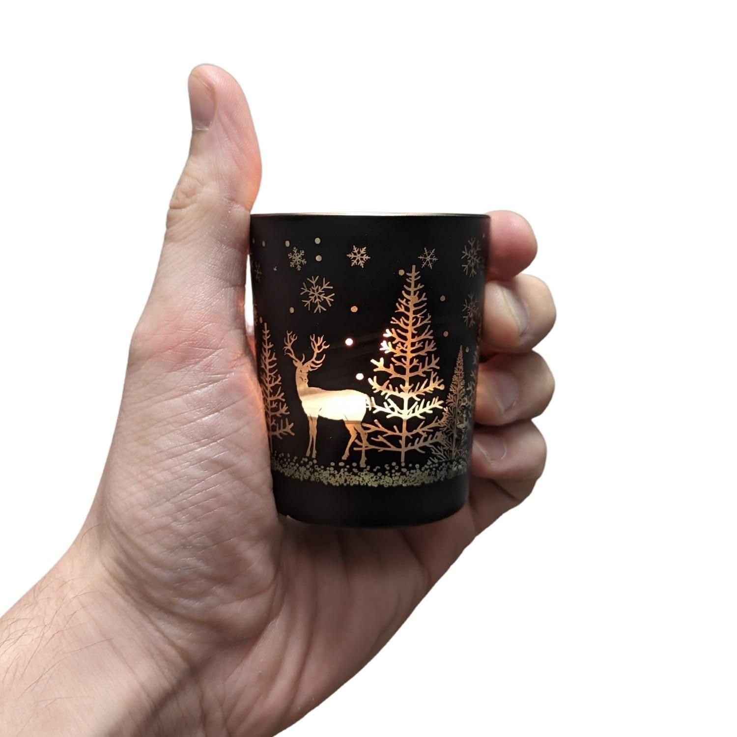 Bring weihnachtliche Stimmung in dein Zuhause! Diese 12 Teelichthalter aus Glas mit weihnachtlichen Motiven in Schwarz-Gold schaffen eine gemütliche Atmosphäre. Besonderheit: Die Gläser sind innen verspiegelt und werfen wunderschöne Lichteffekte. Perfekt für Standard-Teelichter oder LED-Kerzen. Maße: 55mm oberer Durchmesser, 48mm unterer Durchmesser, 68mm Höhe. Ideal als Tischdeko, für Fensterbänke oder den Kaminsims. Schaffen eine warme, festliche Stimmung für die Vorweihnachtszeit oder Heiligabend. Auch als Geschenk für Weihnachtsfans bestens geeignet! Einfach Teelicht rein, anzünden und den Zauber genießen.