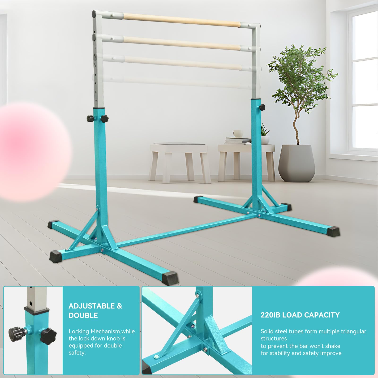 Absolute Sicherheit steht an erster Stelle: Die stabile Stahlkonstruktion mit dreieckiger Basis wackelt nicht und rutscht nicht weg. Die Anti-Rutsch-Gummifüße haften super auf dem Boden. Mit dem 6-Punkt-Standfuß und dem Dual-Lock-System ist dein Kind sicher wie in der Profi-Turnhalle.