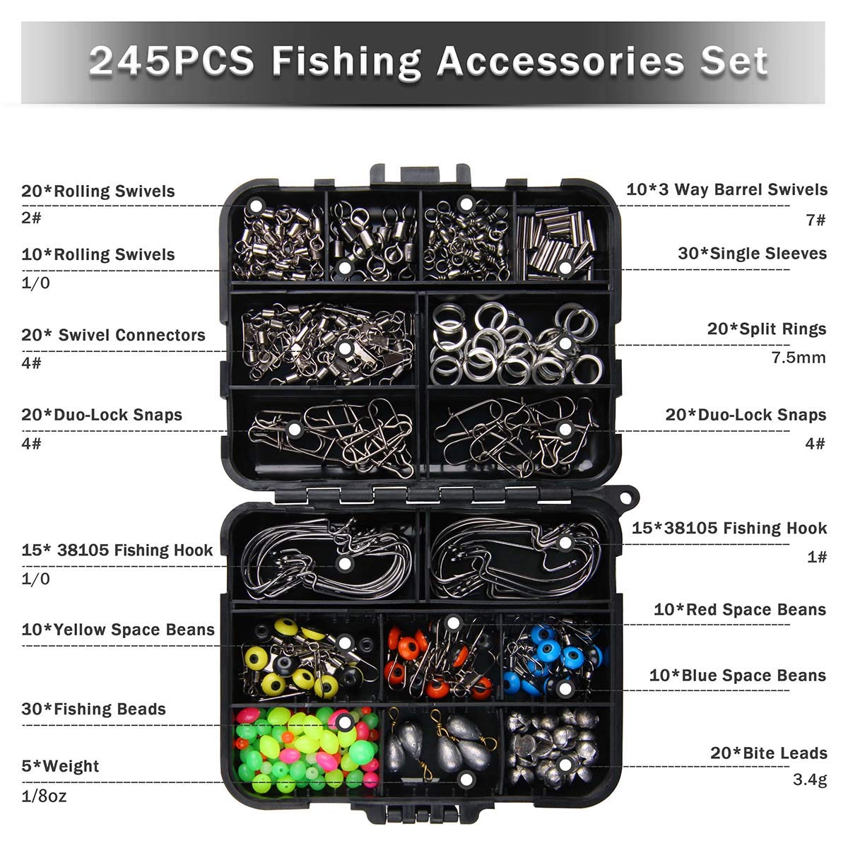 Angler, dieses 140-teilige Set von IWILCS hat alles, was das Anglerherz begehrt! In der praktischen schwarzen Box (12,1x10,5x3,5cm) findest du 20 Karabiner-Schnappverschlüsse (24mm), 20 Rolling Wirbel (17mm), 20 Kugellager Wirbel (42mm), 20 weitere Kugellagerwirbel (35mm), 30 Angelperlen (5x8mm), 10 3-Wege Wirbel (35x21mm) und 20 T-förmige Drehverbinder (23mm). Alles aus hochwertigem Metall und Kunststoff, rost- und korrosionsbeständig. Die Box hat durchsichtige Fächer, sodass du alles super organisiert und griffbereit hast. Perfekt für Salzwasser-Angeln, Trolling, Bootsfischen oder Hochsee-Angeln. Einfach in den Rucksack packen und los geht's! Auch ein tolles Geschenk für Angel-Freunde. Mit diesem Set bist du für jeden Angelausflug bestens ausgerüstet - ob Profi oder Hobbyangler!