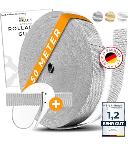 Deine Rollladen wollen nicht mehr hoch? Dieser Inovatec Rollladengurt ist die Lösung! Mit 50m Länge hast du genug für mehrere Fenster. Super reißfest durch Querrippen und UV-stabil - verblasst nicht in der Sonne. Der Perlonkantenschutz macht ihn extra langlebig. Einfach zuschneiden auf die benötigte Länge (Faustformel: Fensterhöhe x 2,5). Made in Germany Qualität! 🪟 Breite: 14mm 🪟 Länge: 50m 🪟 Farbe: Beige 🪟 UV-beständig 🪟 Reißfest 🪟 Made in Germany