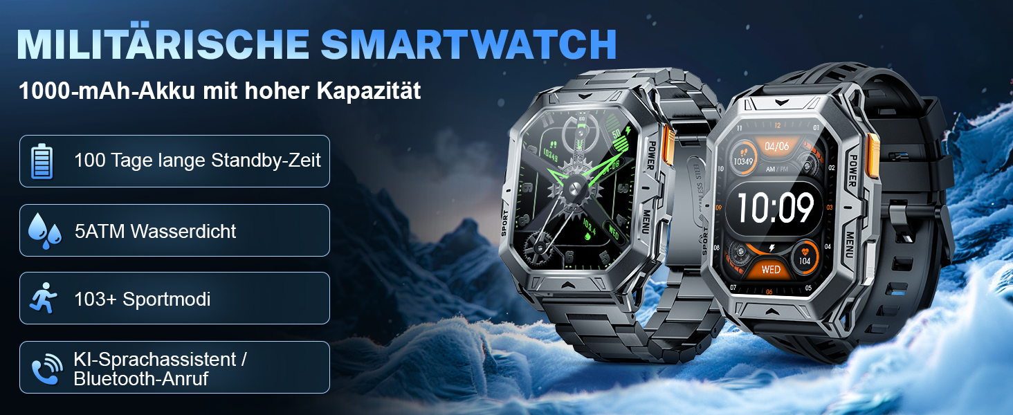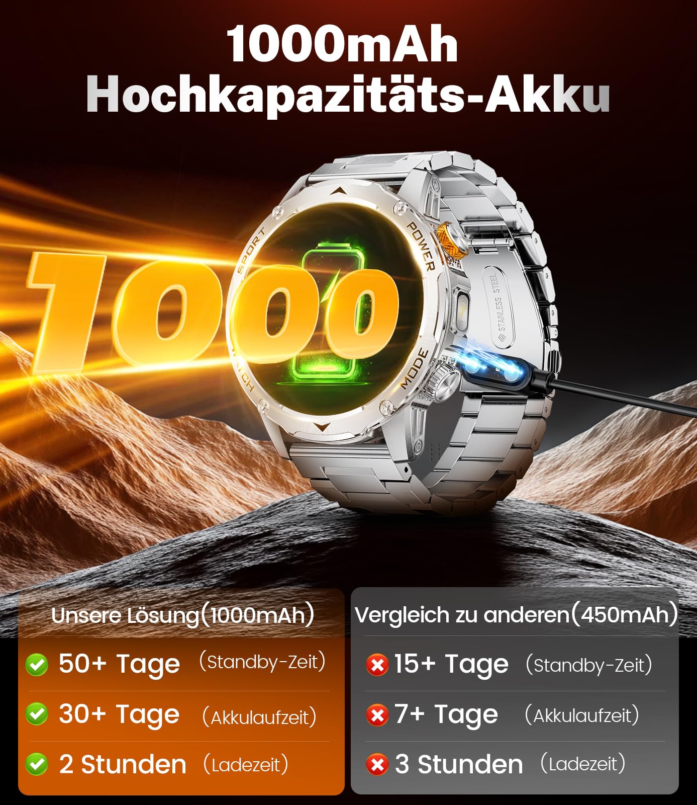 Männer, aufgepasst! Die DREMAC Militär Smartwatch ist nicht nur robust, sondern hat auch Power für Tage - bis zu 15 Tage hält der riesige 1000mAh Akku! Das 1.75\ HD Display ist super klar und zeigt alles an, was du brauchst. Besonders praktisch: Die integrierte Taschenlampe rettet dich in dunklen Situationen - ob beim Camping oder wenn du nachts die Haustür aufschließen musst. Mit über 130 Sportmodi trackst du jede Bewegung, vom Joggen bis zum Gym-Workout. Der 24/7 Herzfrequenzmonitor und Schlafanalyzer geben dir Einblicke in deine Gesundheit (Disclaimer: Nur zur Referenz, nicht für medizinische Diagnosen). Telefoniere direkt von der Uhr aus, bekomme Benachrichtigungen von Social Media und steuere deine Musik - alles ohne das Handy zu zücken. Das Design ist sowohl sportlich als auch elegant, perfekt für Business oder Freizeit. Mit IP68 Zertifizierung hält sie auch mal Spritzwasser aus. Wechsel zwischen 150+ Zifferblättern für deinen persönlichen Style. Ob beim Abenteuerurlaub oder im Büroalltag - diese Smartwatch ist dein zuverlässiger Begleiter!