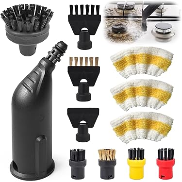 Mach deinen Kärcher Dampfreiniger noch vielseitiger! Dieses 15-teilige Set enthält alles für perfekte Reinigungsergebnisse. Enthalten sind 5 kleine Bürsten in verschiedenen Farben für unterschiedliche Aufgaben, 1 große Rundbürste für große Flächen, 1 verlängerte Düse für schwer erreichbare Stellen, 1 Reinigungsbürste mit Schaber, 3 Mikrofaser-Überzüge und 4 Dichtungsringe. Kompatibel mit Kärcher SC1, SC2, SC3, SC4, SC5 und CTK10. Die farbigen Bürsten helfen bei der Zuordnung: rot für Waschbecken, gelb für Grill, Kupfer für stark verschmutzte Herde. Einfache Installation - einfach in die Bajonettöffnung stecken und verriegeln. Aus hochwertigem Nylon und ABS für lange Haltbarkeit auch bei Dampfhitze. Professionelle Reinigungsergebnisse für dein ganzes Zuhause!