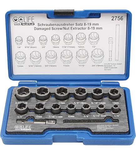 Rettung für rostige und festgerostete Schrauben! Dieses 15-teilige Profi-Set macht Schluss mit Ärger an Auto, Motorrad oder Haushaltsgeräten. Enthält 13 verschiedene Größen von 8mm bis 19mm, plus Eisenstange und Adapter. Aus hochwertigem Chrommolybdänstahl - super hart und korrosionsbeständig. Das spiralförmige Profil greift auch bei völlig rundgedrehten Schraubenköpfen noch sicher. Einfach mit 3/8-Schraubenschlüssel verwenden. Perfekt für die Werkstatt, Garage oder unterwegs. Nie wieder an festgerosteten Muttern verzweifeln - dieses Set ist dein bester Helfer!