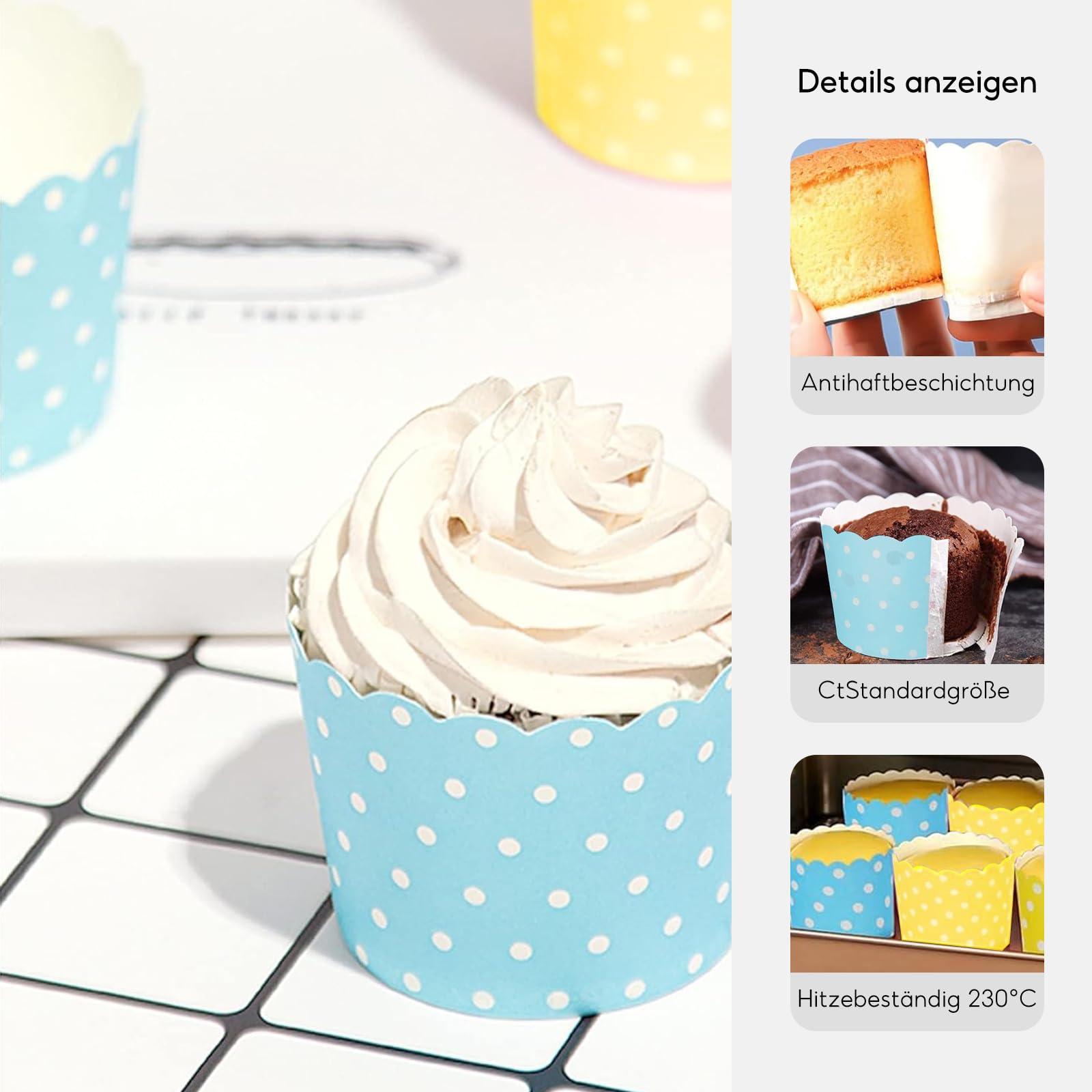 Backst du gern Cupcakes oder Muffins? Mit diesen 150 bunten Förmchen wird's noch schöner! Im Set sind je 50 Stück in Rosa, Blau und Gelb - alle mit weißen Punkten verziert. Aus natürlichem Zellstoff in Lebensmittelqualität, hitzebeständig bis 150°C. Jedes Förmchen ist ca. 6x4,7x5 cm groß und passt in Standard-Muffinbleche. Die Innenwand ist ölabweisend beschichtet, damit der Kuchen nicht anklebt und sich leicht lösen lässt. Die verdickten Wände verformen sich nicht so leicht und sorgen für gleichmäßiges Backen. Perfekt für Geburtstage, Hochzeiten, Teepartys oder einfach mal so. Sieht nicht nur hübsch aus, sondern macht auch das Backen einfacher - und das Aufräumen danach!
