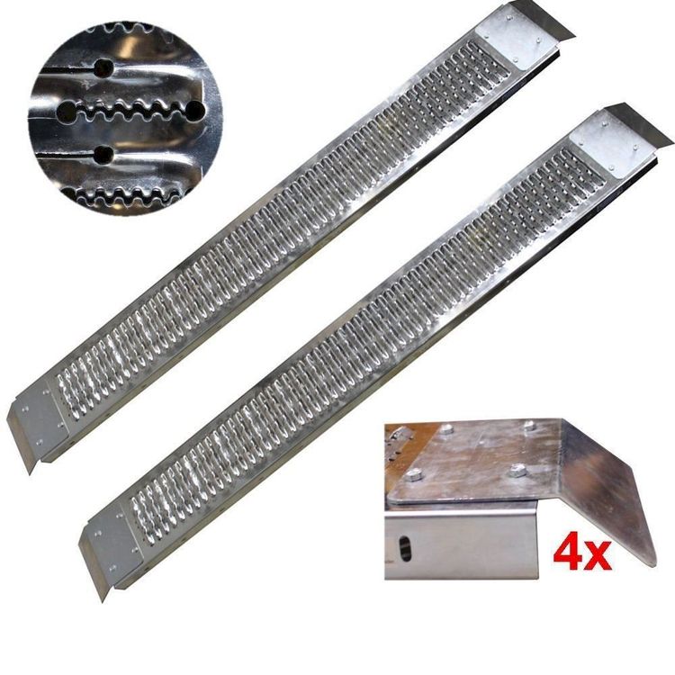 Robuste Auffahrrampen für dein Motorrad, Quad oder ATV! Jede Rampe ist 150cm lang, 23cm breit und hat ne maximale Einfahrhöhe von 42,8cm. Aus verzinktem Stahl gefertigt, sind die super stabil und rostbeständig - perfekt für den Außeneinsatz. Mit ner Tragkraft von 600kg pro Set (also 300kg pro Rampe) machst du da nichts kaputt. Das gelochte Design ist rutschfest und lässt Regenwasser ablaufen, sodass du bei jedem Wetter sicher beladen kannst. Die rutschfeste Kopfplatte schützt deine Fahrzeugheckklappe und die mitgelieferten Sicherheitsgurte sorgen für zusätzliche Stabilität. Klappbar auf 75cm - nach Gebrauch einfach zusammenklappen und platzsparend im Kofferraum oder Garage verstauen. Ob für Anhänger, LKW oder einfach nur um dein Motorrad in den Transporter zu kriegen - damit geht's easy!