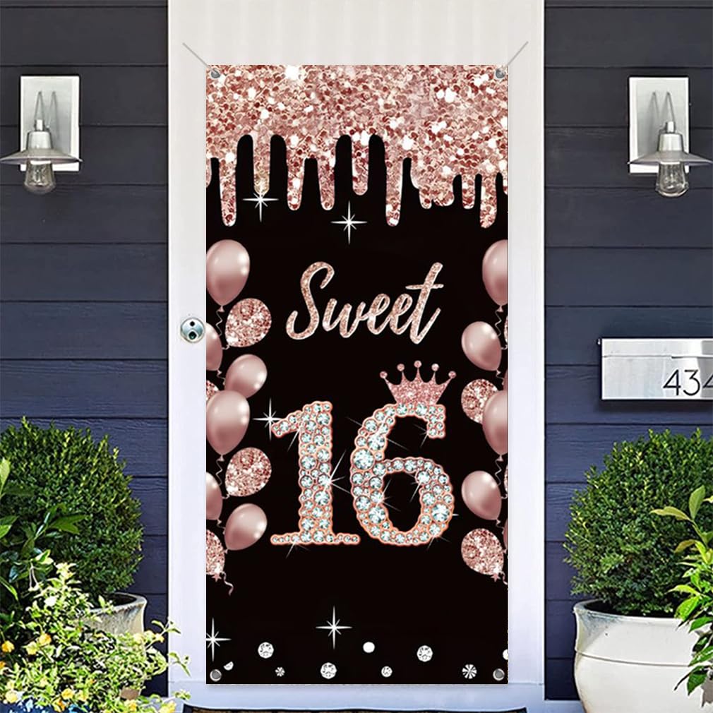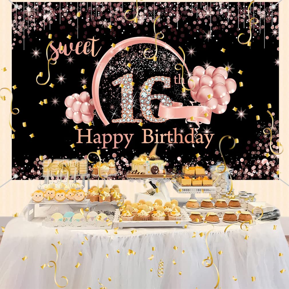 • 16. Geburtstag Dekoration Für Mädchen - Stoff Banner 90x180cm In Rosegold