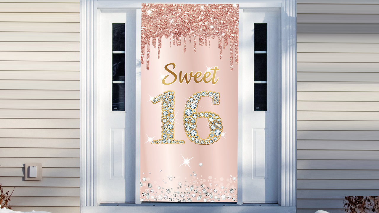 Alles Gute zum 16.! Mit diesem super süßen Stoff-Banner machst du die Party perfekt. Das Design in Rosegold mit glitzernden Punkten und ner Krone sieht einfach klasse aus. Maße: 90x180cm - also richtig was her gemacht! Aus robustem Vinyl, reißfest und mit lebendigen Farben. Kann als Hintergrund, Türdekoration oder Tischdecke verwendet werden. Mit 4 Ösen zum Aufhängen (Seil nicht dabei). Wenn Falten drin sind: Einfach aufhängen und spannen, oder vorsichtig bügeln. Macht jedes Geburtstagsfoto zum Hit!