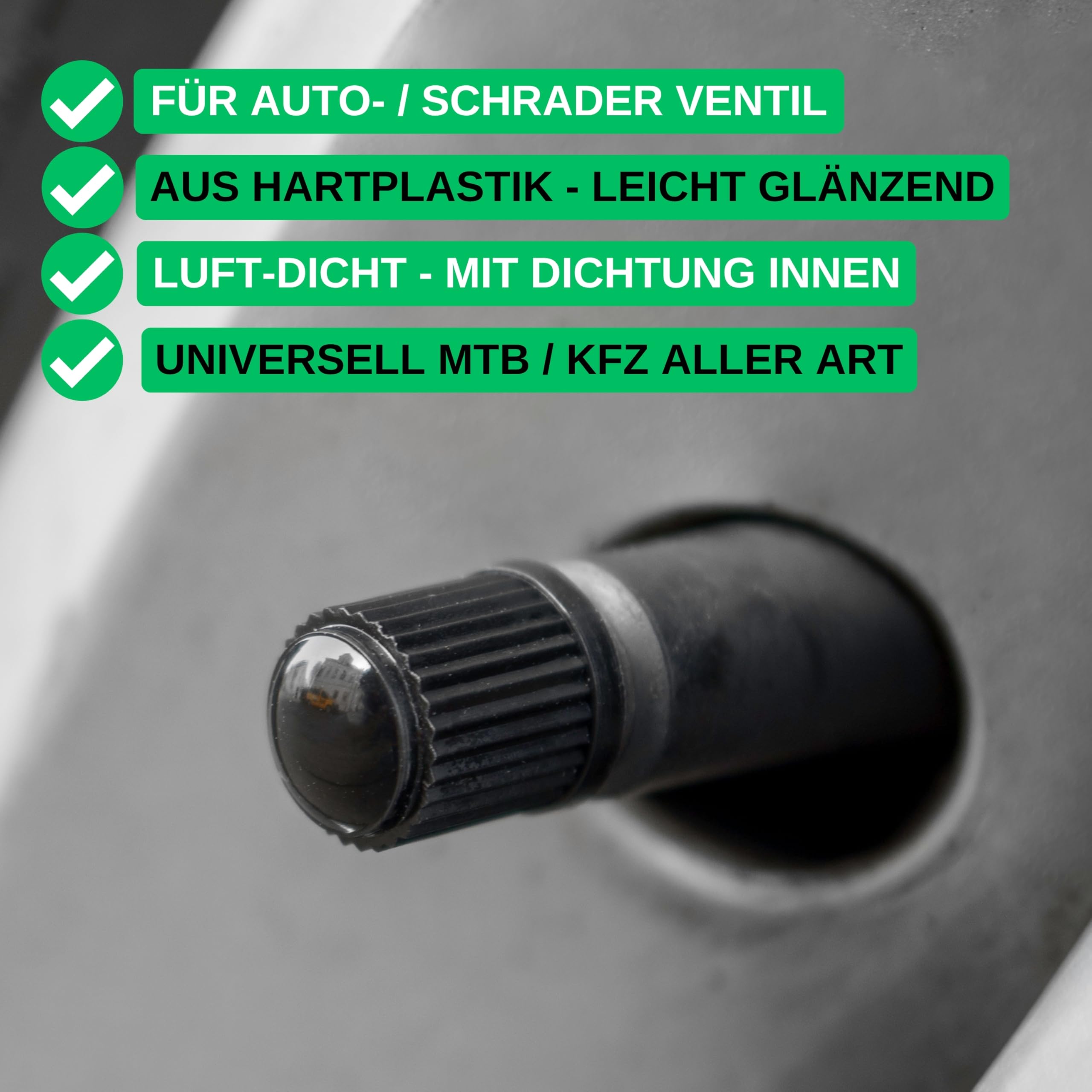 Klein, aber oho! Die JRYXDS Ventilkappen im 16er-Set sind die perfekte Pflege für Ihre Reifen. Aus hochwertigem Gummi gefertigt, schützen sie die Ventile zuverlässig vor Staub, Schmutz und Feuchtigkeit - so beugen Sie lästigen Luftverlusten vor. Mit einer Höhe von 1,3 cm und 1 cm Durchmesser passen sie auf fast alle gängigen Reifen: Ob Auto, SUV, Motorrad oder Lkw - einfach aufschrauben, und schon sind die Ventile sicher verpackt. Die schwarze Farbe sieht dabei nicht nur schick aus, sondern ist auch unauffällig und passt zu jedem Fahrzeug. Praktisch: Die Kappen haben eine Dichtung und sind mit Markierungen (VL/VR/HL/HR) versehen, falls Sie genau wissen wollen, welche wo hingehört. Ein Set reicht für vier Räder - und Sie haben sogar noch Ersatz! Einfache Handhabung, guter Schutz und ein gepflegtes Gesamtbild für Ihr Fahrzeug. Denn wer seine Reifen liebt, der schützt auch die kleinen Details. Perfekt für alle, die Wert auf Sauberkeit und Langlebigkeit legen. Einfach mal ausprobieren - Ihr Reifendruck wird es Ihnen danken!