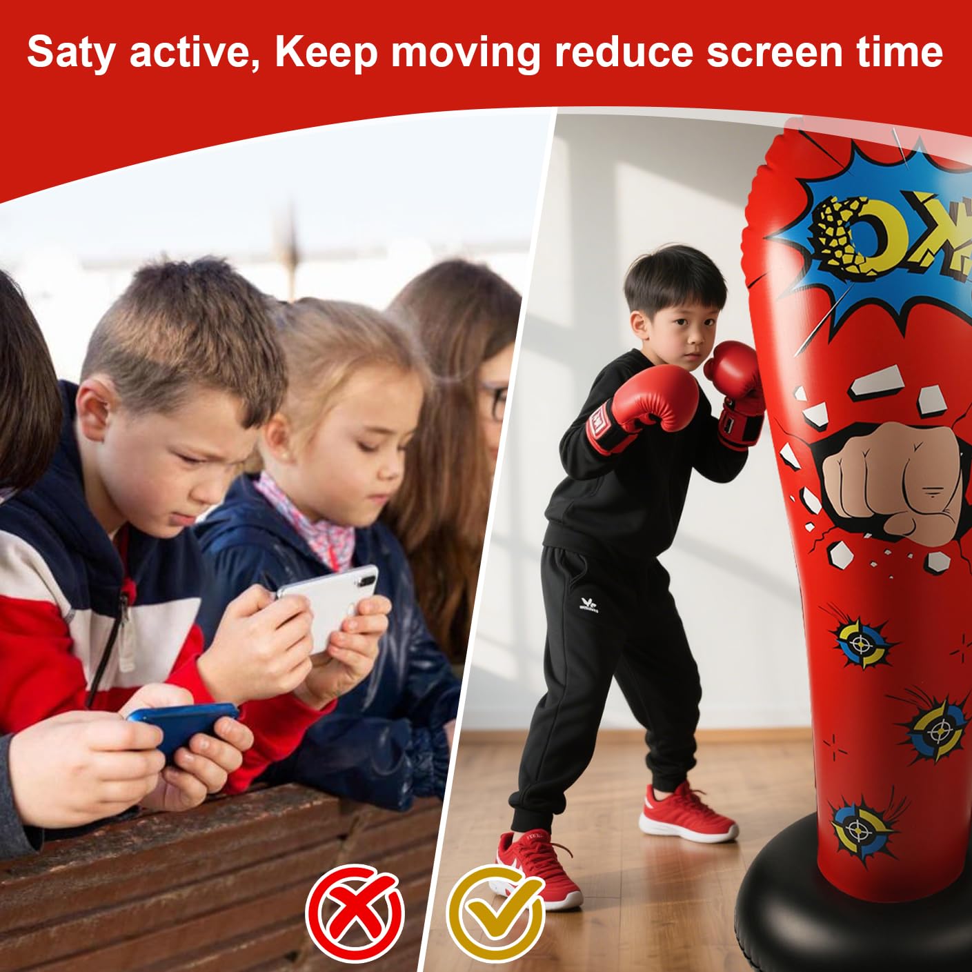 Perfektes Boxtraining für Kids! Dieser 160cm hohe Boxsack ist aufblasbar und hat einen stabilen Sockel für Wasser/Sand-Füllung. Inklusive Boxhandschuhen aus weichem Material - schützt Kinderhände. Mit Luftpumpe zum einfachen Aufpumpen. Ideal für Kinder ab 6 Jahren - fördert Koordination, Reaktion und Fitness. Steht nach Schlägen von selbst wieder auf. Perfekt für drinnen und draußen - ob Wohnzimmer, Garten oder Fitnessraum. Macht Sport zum Spaß und baut Stress ab!