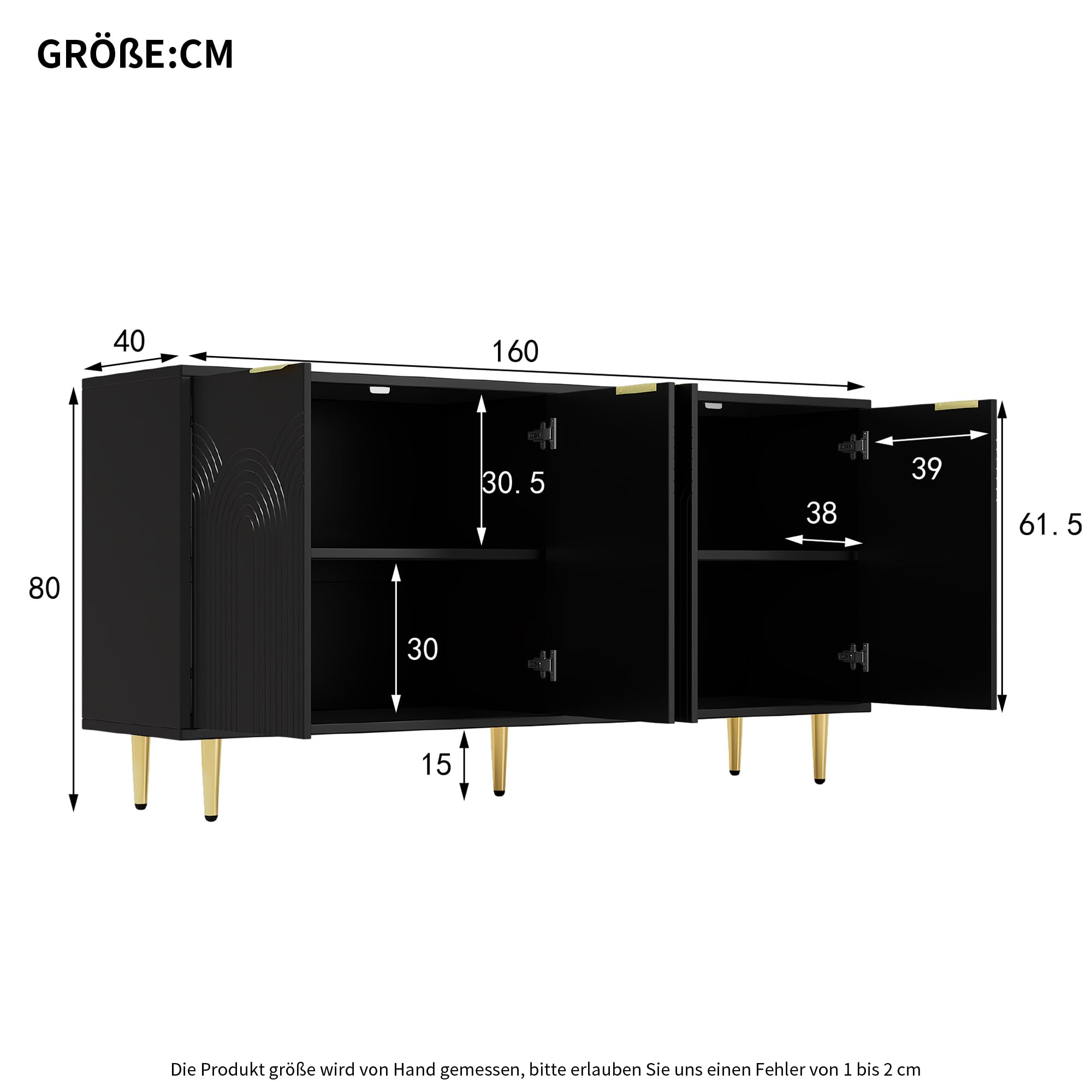 Stilvolles Aufbewahren war noch nie so einfach! Dieses elegante Sideboard von SogesHome mit 160cm Breite bringt Ordnung in dein Zuhause und sieht dabei noch fantastisch aus. Mit vier Türen und höhenverstellbaren Einlegeböden bietet es jede Menge Stauraum für Geschirr, Deko, Spielzeug oder Haushaltsutensilien. Die halbkreisförmigen, goldfarbenen Griffe und die hochglänzenden Metallfüße verleihen dem Möbelstück einen modernen und luxuriösen Touch. Besonders praktisch: Die Soft-Close Scharniere sorgen dafür, dass die Türen sanft und leise schließen - kein lästiges Zuknallen mehr! Die robuste Konstruktion und die schwarze Lackierung garantieren Langlebigkeit und machen das Sideboard zu einem echten Dauerbrenner in deiner Einrichtung. Egal ob im Wohnzimmer, Flur oder Esszimmer - dieses Sideboard passt sich flexibel an deine Bedürfnisse an und harmoniert mit den verschiedensten Einrichtungsstilen. Von modern bis glamourös ist alles möglich. Ein Möbelstück, das nicht nur gut aussieht, sondern auch super funktional ist!