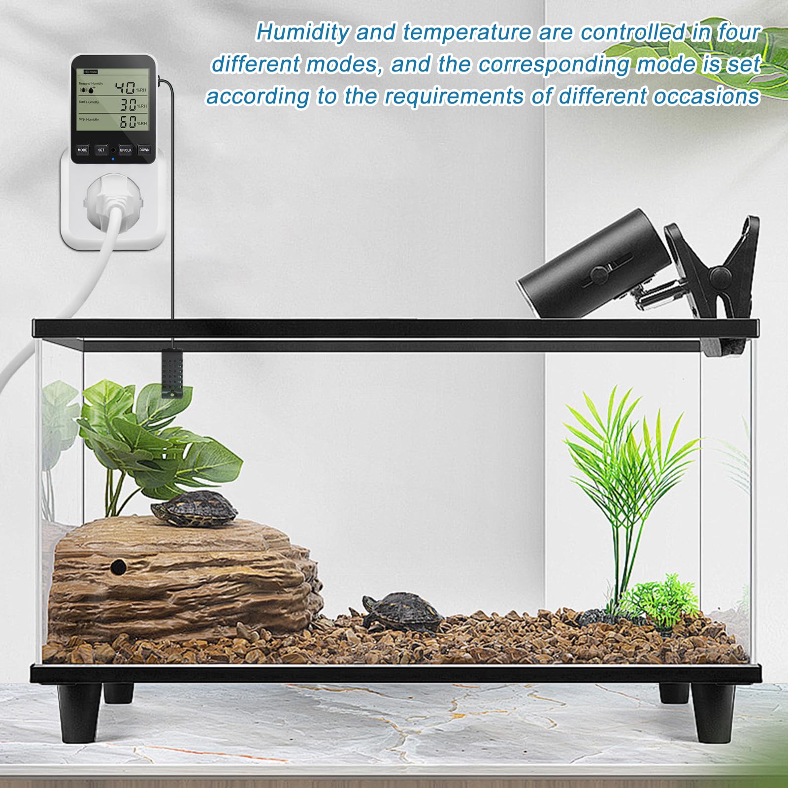 Total smarte Steckdose für perfektes Raumklima! Dieser Gbformat Hygrostat regelt automatisch Luftfeuchtigkeit (20-95% rF) und Temperatur (-10°C bis 50°C). Mit 4 Betriebsmodi: Befeuchtung, Entfeuchtung, Heizung, Kühlung. Die 16A/230V Leistung meistert Luftbefeuchter, Luftentfeuchter und Heizgeräte problemlos. Integrierter Alarm warnt bei Überschreitung der eingestellten Werte. Einfache Kalibrierung möglich, Einstellungen bleiben bei Stromausfall erhalten. Aus sicherem ABS-Material mit Fehleranzeigen bei Sensortrennung oder Kurzschluss. Perfekt für Terrarien, Gewächshäuser, Pilzzucht, Inkubatoren oder zu Hause. Keine Verkabelung nötig - einfach einstecken und einstellen. Wechsel zwischen °C und °F mit 3-sekündigem Druck auf SET-Taste. Der intelligente Timer ermöglicht zyklischen Betrieb. Professionelle Klimaregelung für jeden Anwendungsbereich - einfach genial!