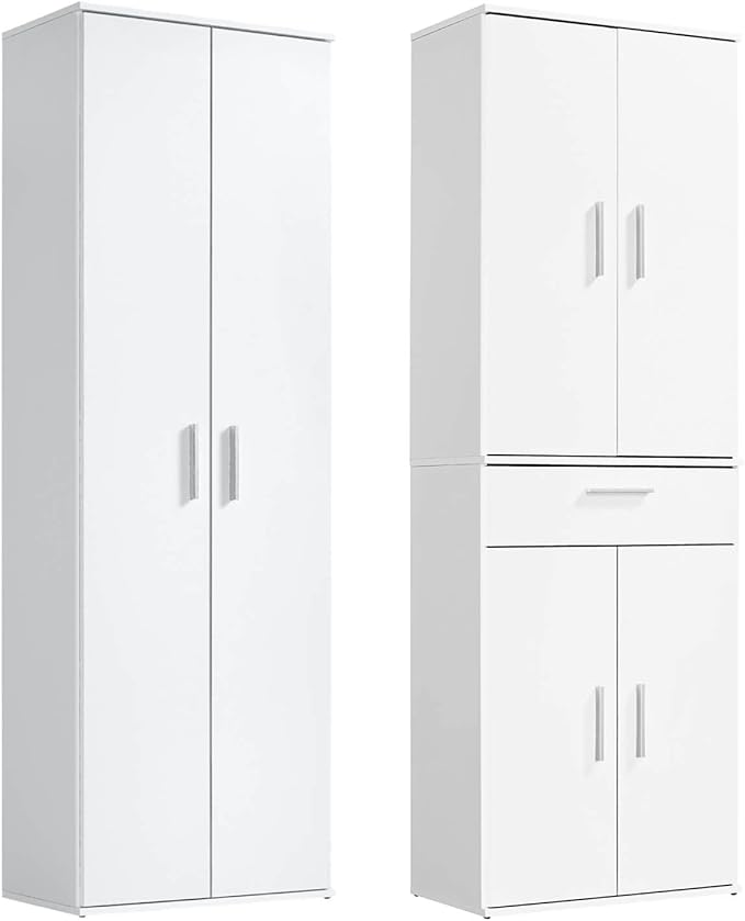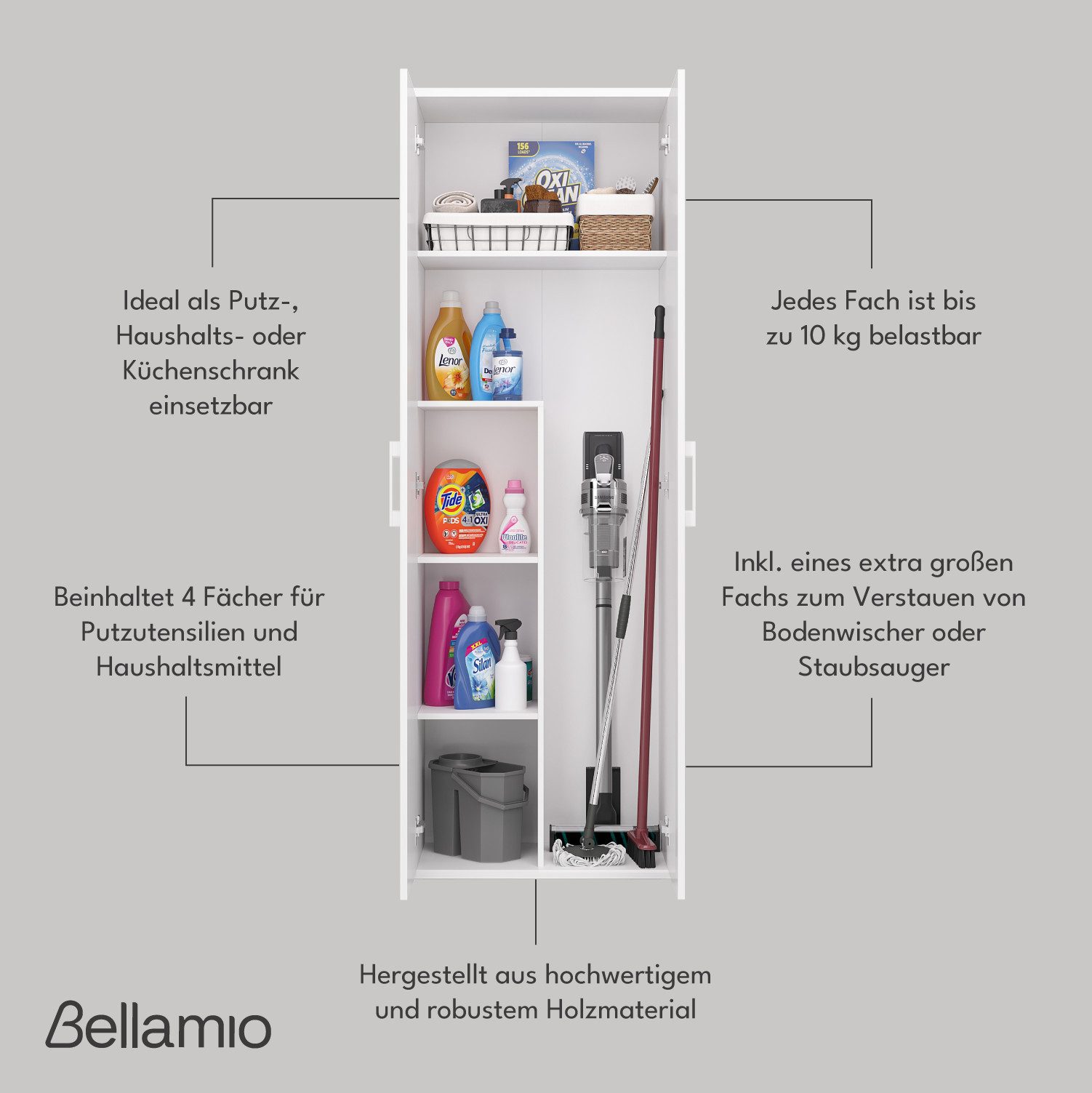 Ordnung und Stil in einem! Der Bellamio Lurio Mehrzweckschrank ist der perfekte Aufbewahrungshelfer für jedes Zuhause. Mit den Maßen 176x33x60cm bietet er viel Stauraum auf minimaler Fläche. Hinter den zwei Türen verbergen sich 4 praktische Ablagefächer und 1 großes Fach für Staubsauger oder Besen. Aus robustem, kratzfestem Holzwerkstoff in elegantem Weiß - passt sich jeder Einrichtung an. Perfekt für Küche, Flur, Keller oder Waschküche. Einfache Montage und pflegeleichte Oberfläche. Ob als Putzmittelschrank, Büroorganizer oder Werkzeugaufbewahrung - dieser Schrank erfüllt alle deine Aufbewahrungswünsche! Schafft Ordnung und behält dabei einen stylischen Look. Ein echter Allrounder für mehr Übersicht in deinen vier Wänden!