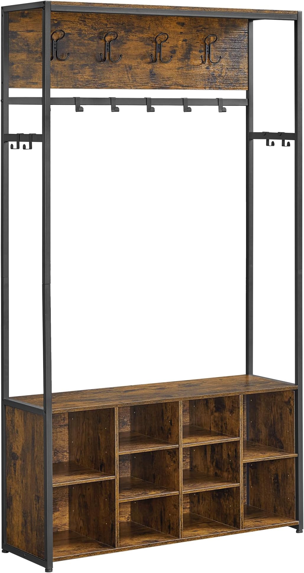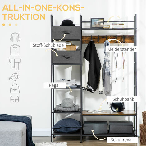 Boah, dieser Garderobenständer von HOMCOM ist ja mal der absolute Alleskönner für deinen Flur! Mit seinem 6-in-1 Design vereint er alles was du brauchst: 10 verstellbare Haken für Jacken und Taschen, eine gemütliche Sitzbank zum Schuhe anziehen, ein zweistufiges Schuhregal für bis zu 6 Paar Schuhe, zwei praktische Stoffschubladen für Kleinigkeiten und sogar ein Oberregal. Bei 100x40x180 cm findet der auch in kleineren Wohnungen Platz und bringt sofort Ordnung in das Chaos. Das industrielle Vintage-Design in rustikalem Braun sieht total stylisch aus und passt in fast jede Einrichtung. Mit der robusten Konstruktion aus Metall und Spanplatten hält das Teil was aus - bis zu 40 kg Gesamtlast! Die verstellbaren Fußpolster und das Anti-Kipp-Set sorgen für absolute Stabilität. Montage ist zwar nötig, aber danach hast du einen organisierten Eingangsbereich der sich sehen lassen kann. Perfekt für Flur, Wohnzimmer oder Schlafzimmer - damit wird dein Zuhause sofort einladender!