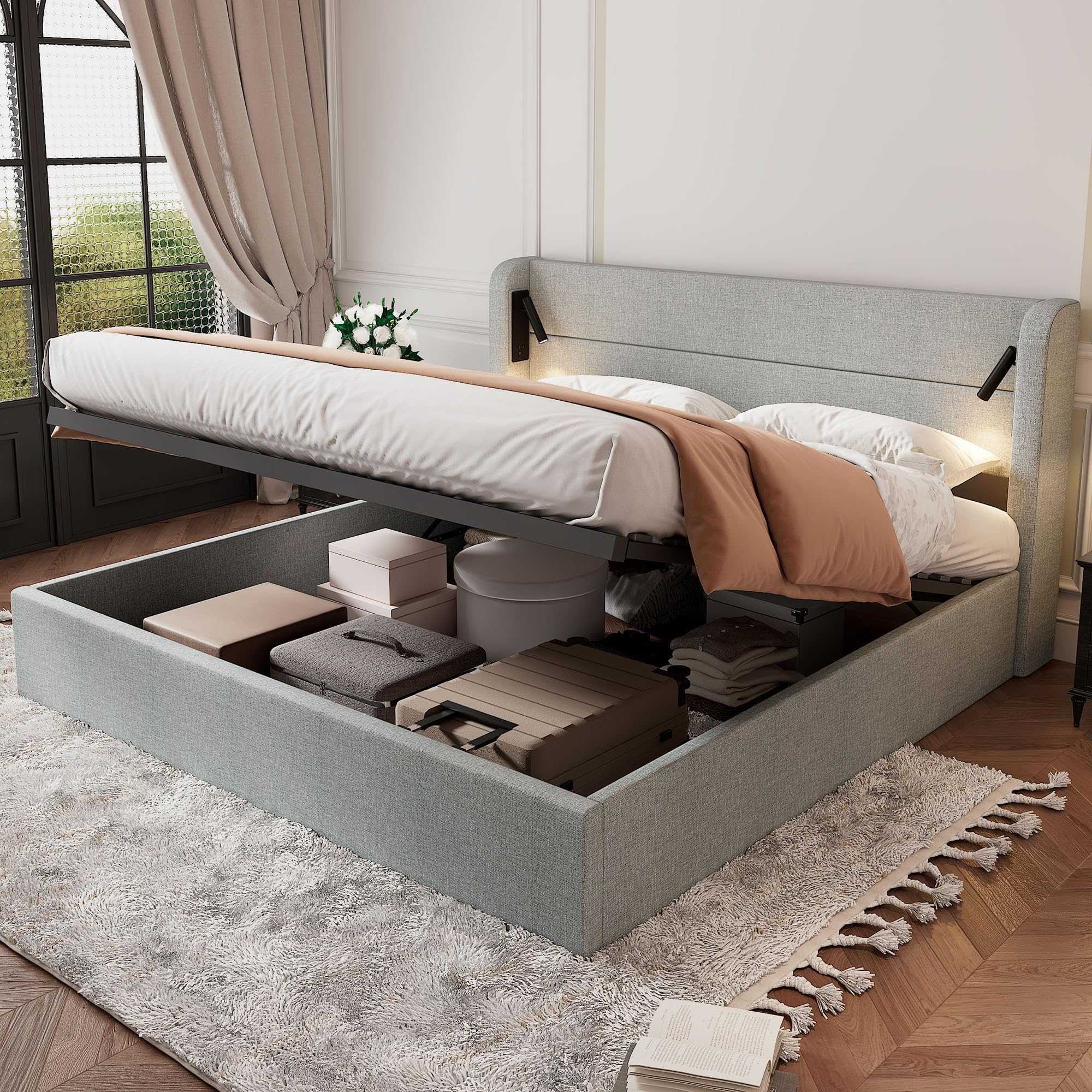 EINHOM Bett 180x200 Mit LED & USB - Polsterbett Mit Stauraum Und App-Steuerung In Beige