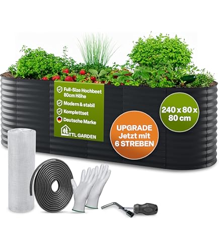 Gärtnern war noch nie so easy und stylisch! Dieses Mega Holz Aluminium Hochbeet ist einfach der Hammer für alle, die frisches Gemüse und Kräuter lieben. Mit satten 185x95x74cm und ner riesigen Anbaufläche von 1,62m² hast du Platz ohne Ende für deine Gartenprojekte. Das Beste: Es ist aus beschichtetem Aluminium, also absolut wetterfest und pflegeleicht - kein Streichen, kein Rost, keine Probleme! Die cleveren Nut- und Feder-Hohlkammerprofile sorgen nicht nur für ne super Stabilität, sondern isolieren auch noch richtig gut. So bleiben deine Pflanzen im Sommer kühl und im Winter geschützt. Der Aufbau ist ein Kinderspiel - einfach die Teile zusammenstecken, mit den verdeckten Edelstahlschrauben fixieren und schon kann's losgehen. Keine extra Folie nötig, das Aluminium hält Feuchtigkeit super stand. Das abgerundete Abschlussprofil sieht nicht nur edel aus, sondern ist auch praktisch als Ablage. Ob aufm Balkon, Terrasse oder im Garten - dieses Hochbeet macht überall ne gute Figur. Und wenn dir das noch nicht reicht, gibt's sogar noch größere Varianten! Einfach befüllen, pflanzen und dich über ne reiche Ernte freuen - so macht Gärtnern Spaß!