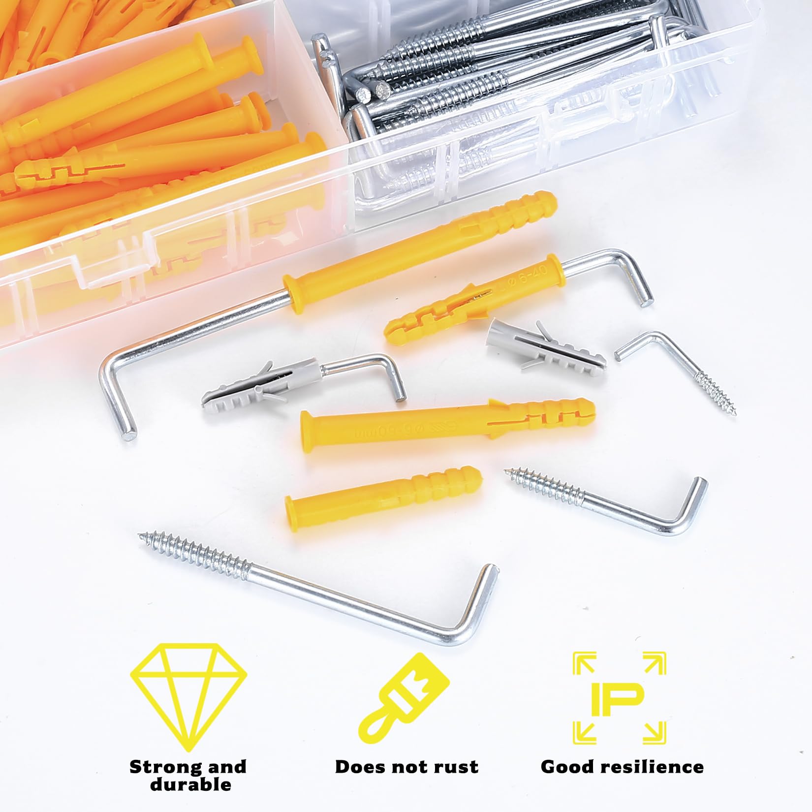 Im Set enthalten: 45 kleine L-Schrauben (2,5x25mm) mit grauen Dübeln, 30 mittlere (3,4x40mm) mit gelben Dübeln und 20 große (3,7x70mm) mit gelben Dübeln. Aus robustem Kohlenstoffstahl gefertigt, brechen die Haken nicht so leicht.