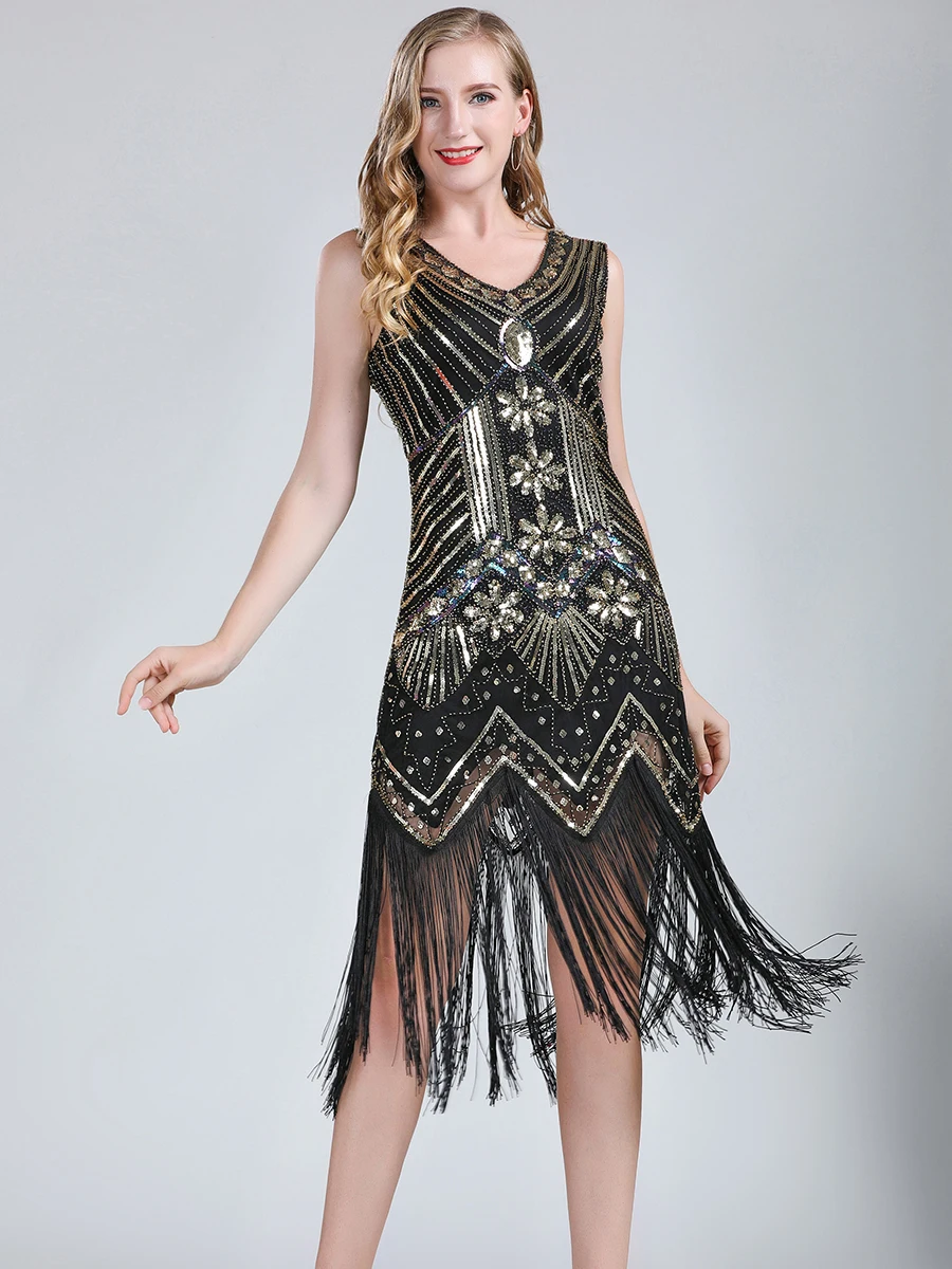 Timewarp gefällig? Dieses 1920er Flapper Kleid von xxxiticat bringt den Gatsby-Style zurück! Mit schimmernden Pailletten und swingenden Fransen am Saum bist du der Star auf jeder Party. Aus weichem Polyester, angenehm auf der Haut und atmungsaktiv. Der V-Ausschnitt und der rückenfreie Schnitt sind einfach nur glamourös! Perfekt für Mottopartys, Karneval, Silvester oder jede andere Feier, bei der du auffallen willst. Aber Achtung: Ist in asiatischer Größe geschnitten, also lieber 'ne Nummer größer bestellen! Am besten von Hand waschen oder zur Reinigung bringen, damit die Pailletten schön bleiben. Mit der hohen Taille und der schlanken Passform betont es deine Figur super. Ob Charleston tanzen oder einfach nur stylisch aussehen - mit diesem Kleid machst du auf jeden Fall Furore!