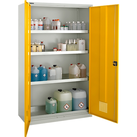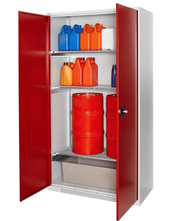 Dieser Gefahrstoffschrank ist ein Muss für jede Werkstatt oder Labor! Mit 192x92x58cm bietet er viel Platz für Chemikalien und Pflanzenschutzmittel. Die 4 höhenverstellbaren Böden und Auffangwannen sorgen für Ordnung und Sicherheit. Aus robustem Stahlblech, pulverbeschichtet für Langlebigkeit. Das 2-riegelige Sicherheitsschloss schützt vor unbefugtem Zugriff. Lüftungslöcher leiten gefährliche Dämpfe sicher ab. Made in EU - hohe Qualitätsstandards und kurze Transportwege. Perfekt für die vorschriftsmäßige Lagerung von Gefahrstoffen. Die Auffangwannen verhindern bei Leckagen Umweltschäden. Verzinkte Einlegeböden für kleine Gebinde - alles sicher verwahrt. Ein unverzichtbares Utensil für jeden, der mit Chemikalien arbeitet. Einfach ein professioneller Schrank für maximale Sicherheit im Umgang mit Gefahrstoffen!